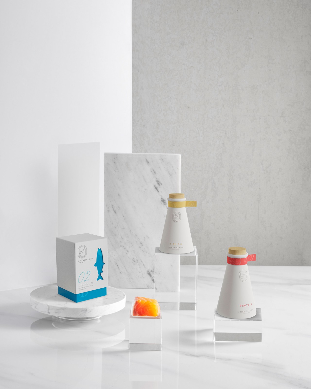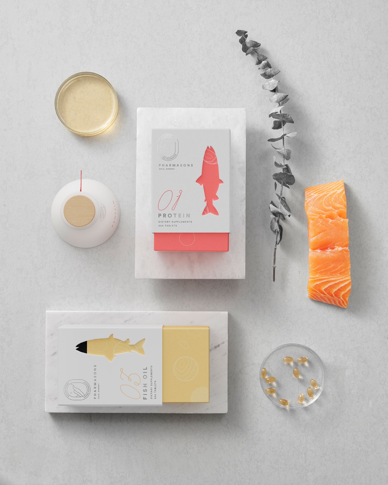 這家基于鮭魚的保健品公司由藥劑師的四個兒子所有,以其傳統(tǒng)和北歐起源而自豪。北極星下方帶有四座山峰的標志象征著公司的根基和家族的脊梁。該設計還采用了靈感來自鮭魚紋理、地形和指紋的圖案。
