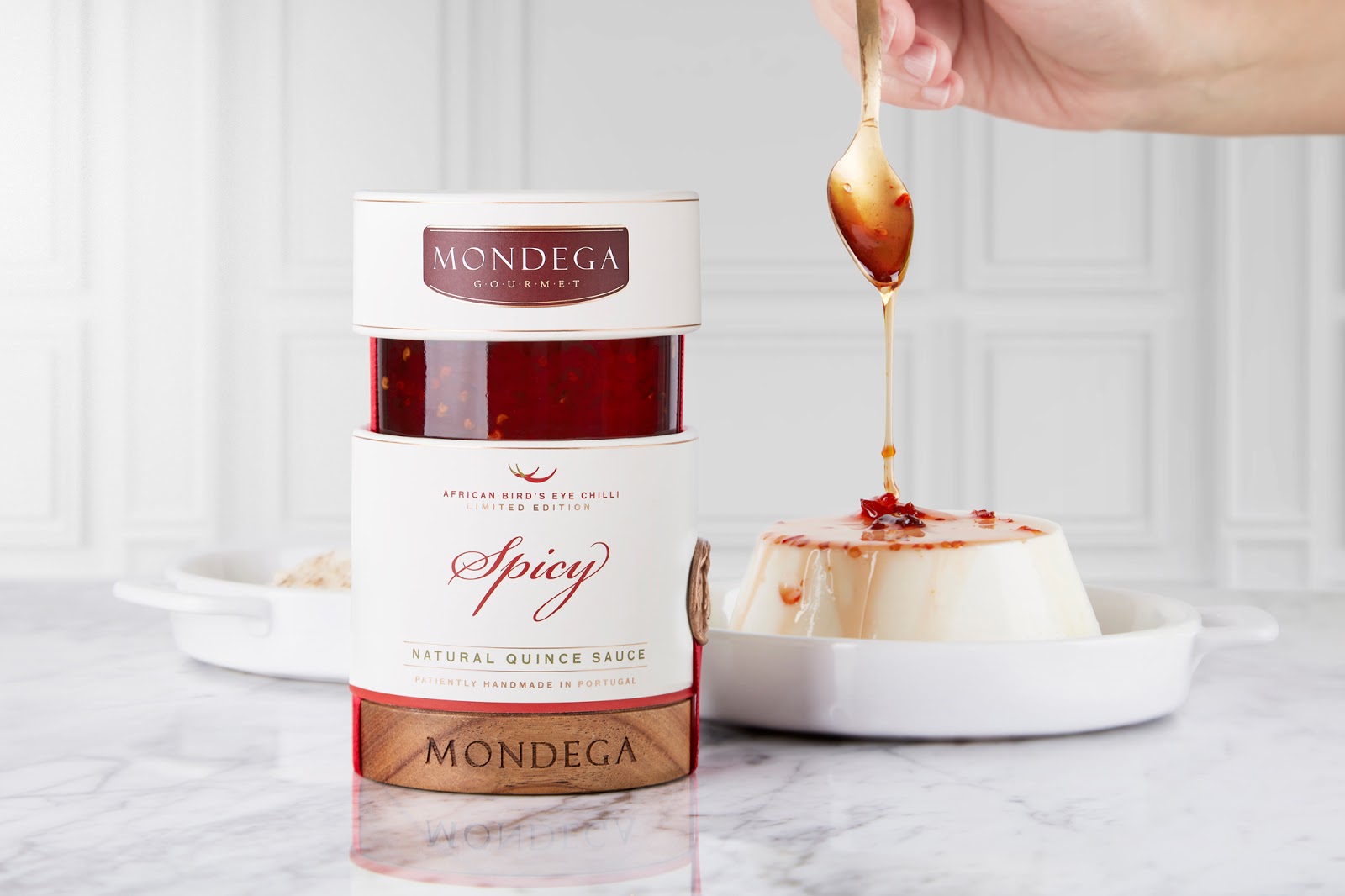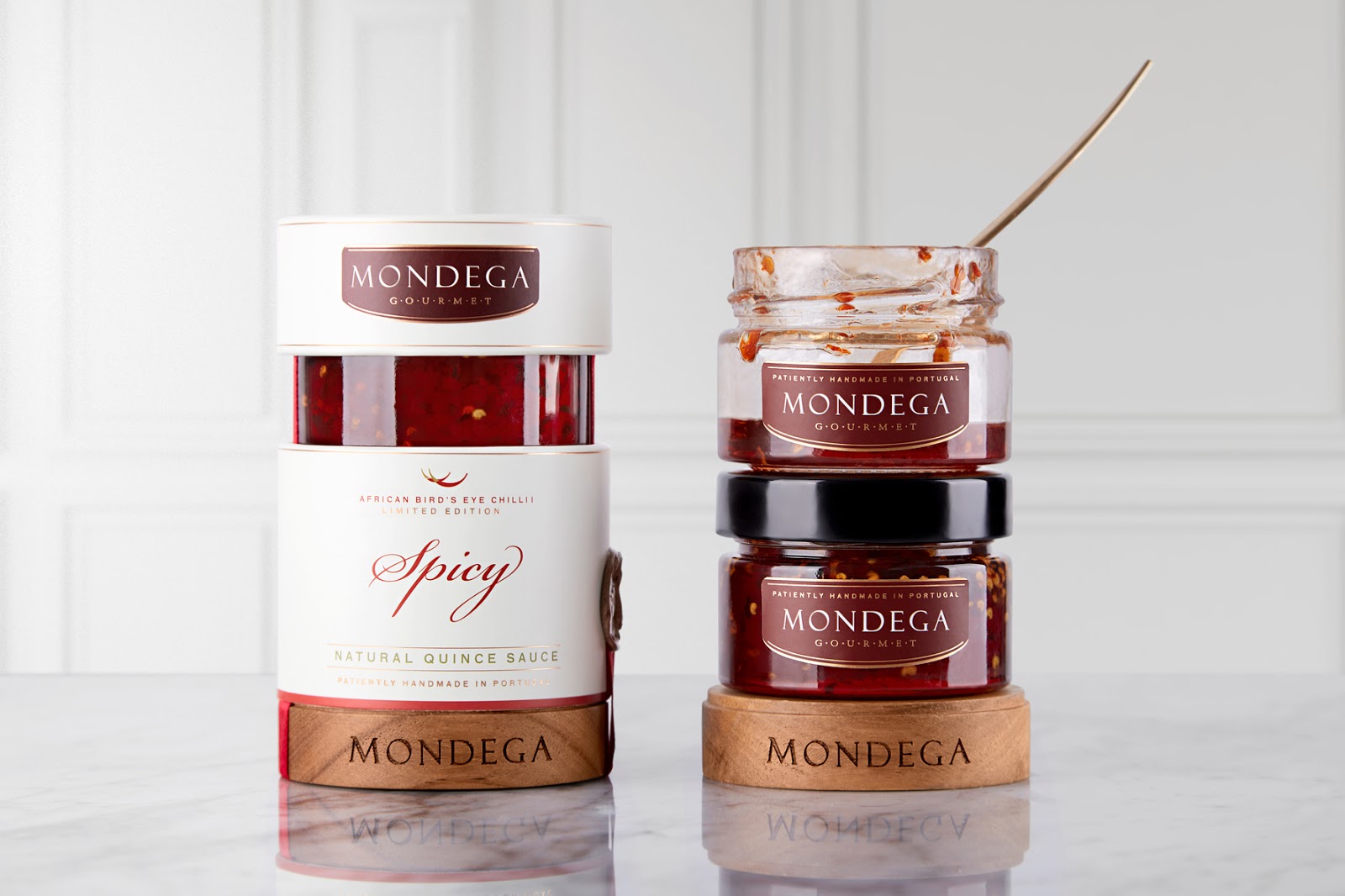 限量生產(chǎn)的 Mondega Gourmet - Natural Spicy Quince Sauce 是一種手工制作的辣醬。此版本采用精心挑選的天然產(chǎn)品制成,采用代代相傳的配方。Mondega Gourmet 要求我們創(chuàng)造一種適合世界各地任何商店櫥窗的包裝。永恒的設(shè)計優(yōu)雅,專注于高端市場。
