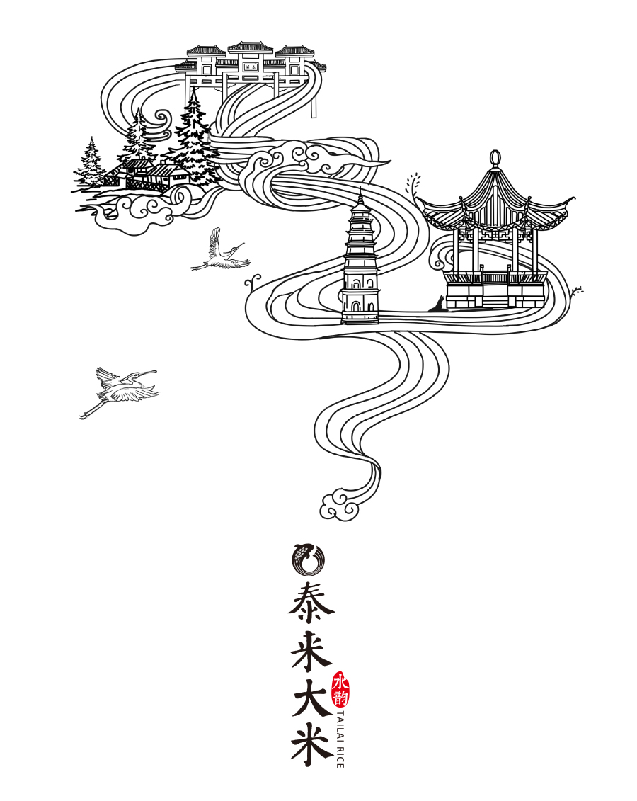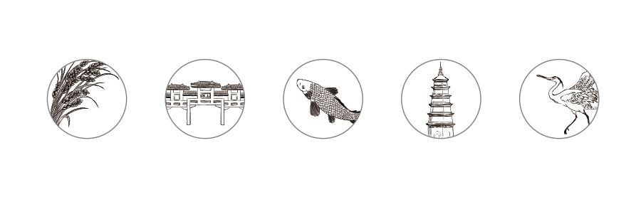 選用大米 / 稻谷 / 魚 / 遼塔 / 鷺 等元素進(jìn)行塑造