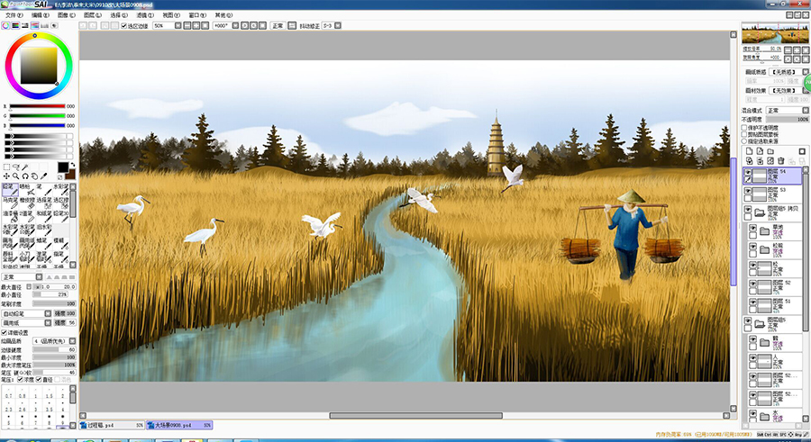 西林插畫師從“水韻”中提取元素,著重描繪水的流動性,以線條為主,體現(xiàn)復(fù)古風(fēng)格。插畫中穿插泰來縣特有的文化標(biāo)志建筑,與插畫形成統(tǒng)一,實現(xiàn)“水韻”這一主題。