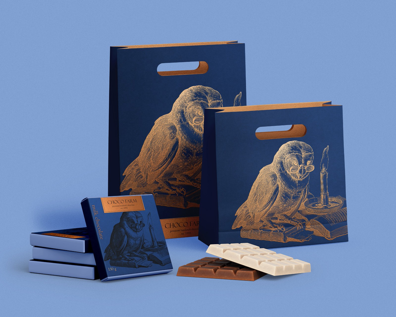 任務(wù)是為白巧克力、牛奶巧克力和黑巧克力以及兩個(gè)小紙袋和中號(hào)紙袋設(shè)計(jì)一個(gè)優(yōu)雅的包裝。業(yè)主的姓氏 Filin 的意思是“貓頭鷹”,這就是我為包裝選擇貓頭鷹插圖的原因。