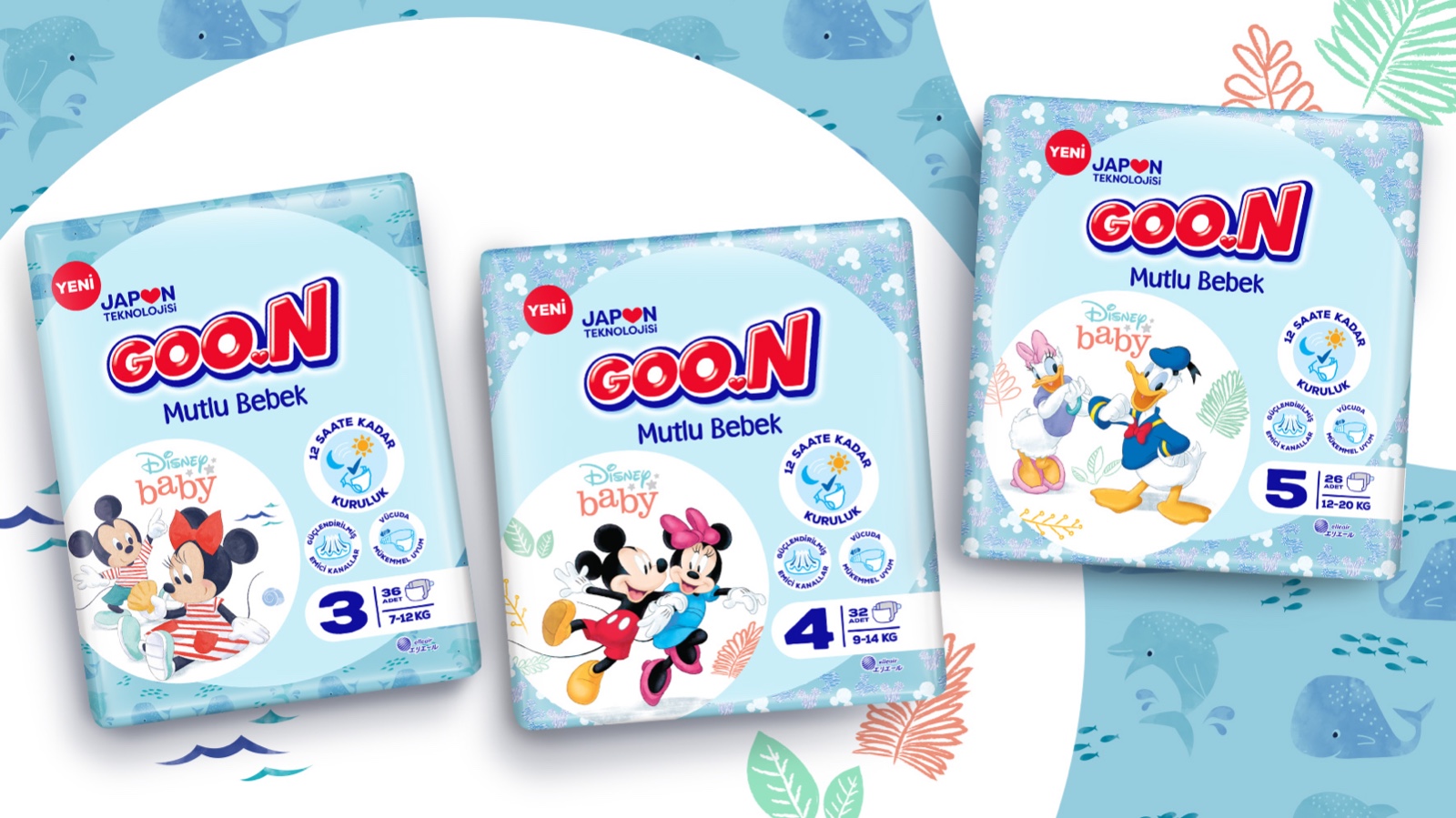 Goon 嬰兒紙尿褲有兩個(gè)子品牌:Mutlu Bebek(Happy Baby)用于標(biāo)準(zhǔn)嬰兒紙尿褲,Premium Soft 用于上段。為了給 Goon 紙尿褲創(chuàng)造一種通用的視覺語言,我們創(chuàng)建了一個(gè)圓形的品牌架構(gòu)。靈感來自標(biāo)志中 GOO 字母的圓形形式。對于 Goon Premium Soft,標(biāo)志下方的金色圓圈是建筑的主要視覺元素。金色代表品牌的高端定位。另一方面,對于 Mutlu Bebek(Happy Baby),在白色圓圈內(nèi)使用了授權(quán)的迪士尼角色,并使用了幼稚的藍(lán)色來與母親們建立更真誠的溝通。盡管圓形形式為 Goon 品牌架構(gòu)創(chuàng)造了一種共同語言,它們不同的尺寸和位置為子品牌提供了差異化。產(chǎn)品功能變成了帶有插圖的圖標(biāo),這些圖標(biāo)是專門為 Goon 品牌架構(gòu)創(chuàng)建的。