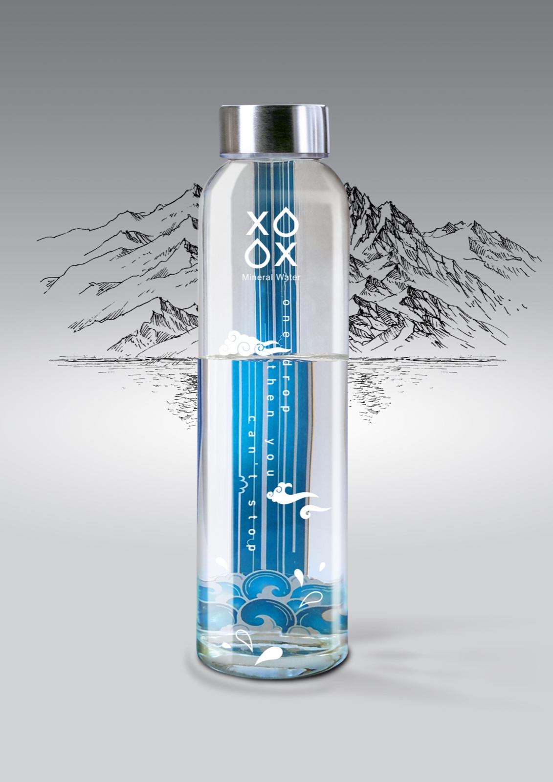 包裝設(shè)計師作者認為礦泉水的品牌名為XO,通過將形式O轉(zhuǎn)換為水滴,X表示沒有水,以及XO的懷舊游戲,這兩個選項都是這個標志的贏家,為給觀眾提供了選擇哪條道路的選項?. 為了設(shè)計包裝,水包裝設(shè)計師以簡化的方式設(shè)計了一個靈感來自伊朗微型畫的瀑布,它被貼在玻璃背面作為雙面標簽。瓶裝水的豐滿度以及水的折射對瀑布圖像的影響使瀑布變得越來越大、越來越寬。一起喝水會使瀑布變得更窄,水也更少。為了設(shè)計包裝,我以簡化的方式設(shè)計了一個靈感來自伊朗微型畫的瀑布,它被貼在玻璃背面作為雙面標簽。水的豐滿度和水的折射對瀑布圖像的影響使瀑布變得更大、更寬。每喝一杯,瀑布就會變得更窄,水也更少?!耙坏危憔屯2幌聛怼钡目谔柤葟娬{(diào)了XO水的適口性,也強調(diào)了對這一重要儲備的濫用,這導(dǎo)致了一場環(huán)境災(zāi)難。將微型云朵放置在玻璃上,創(chuàng)造了一個帶有瀑布的三維空間。