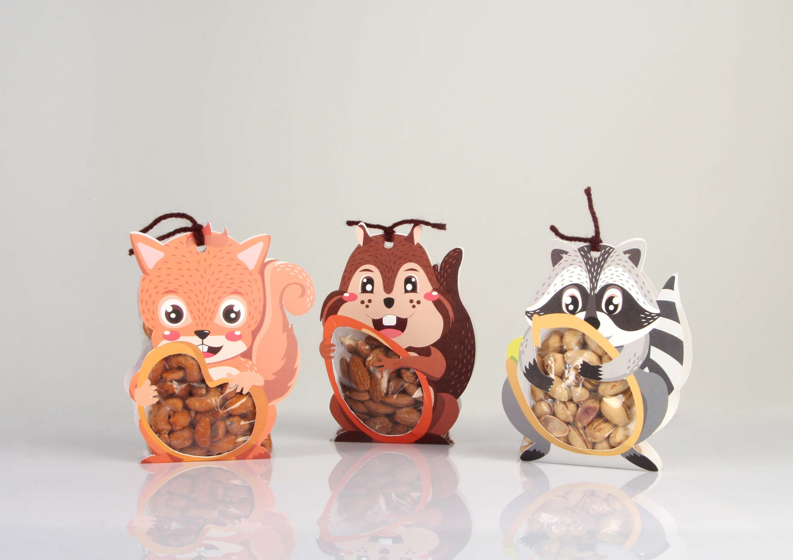 整體外包裝是一個(gè)鉆石形狀,旨在看起來(lái)像一個(gè)堅(jiān)果本身。它也被設(shè)計(jì)成極簡(jiǎn)主義風(fēng)格,只有“迷你麥奇”的標(biāo)題,正面有一個(gè)圖形元素。最后,堅(jiān)果包裝內(nèi)的包裝由3種不同的動(dòng)物組成,它們食用提供的不同堅(jiān)果。這些動(dòng)物是花栗鼠、松鼠和浣熊。背面設(shè)計(jì)包括有關(guān)螺母、凈重和有效期的信息。