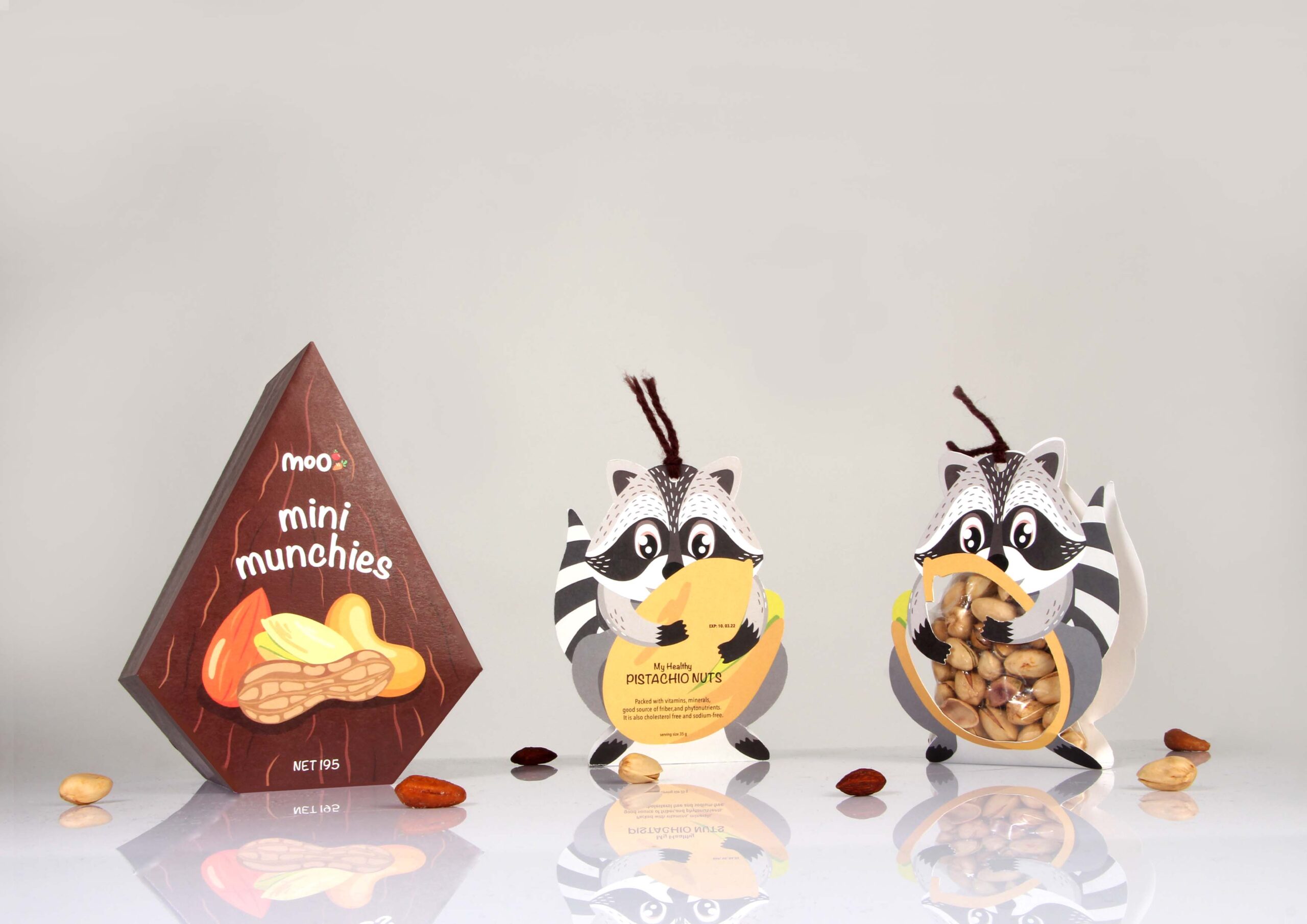 這種包裝主要面向18至28歲的消費(fèi)者。Moo創(chuàng)造了一個(gè)由3種不同類型的流行堅(jiān)果組成的包裝;杏仁、開(kāi)心果和腰果。研究表明,堅(jiān)果是吃零食和工作時(shí)最健康的選擇之一,因?yàn)樗鼘?duì)我們的大腦有很多好處。這些零食的名字叫“迷你零食”。