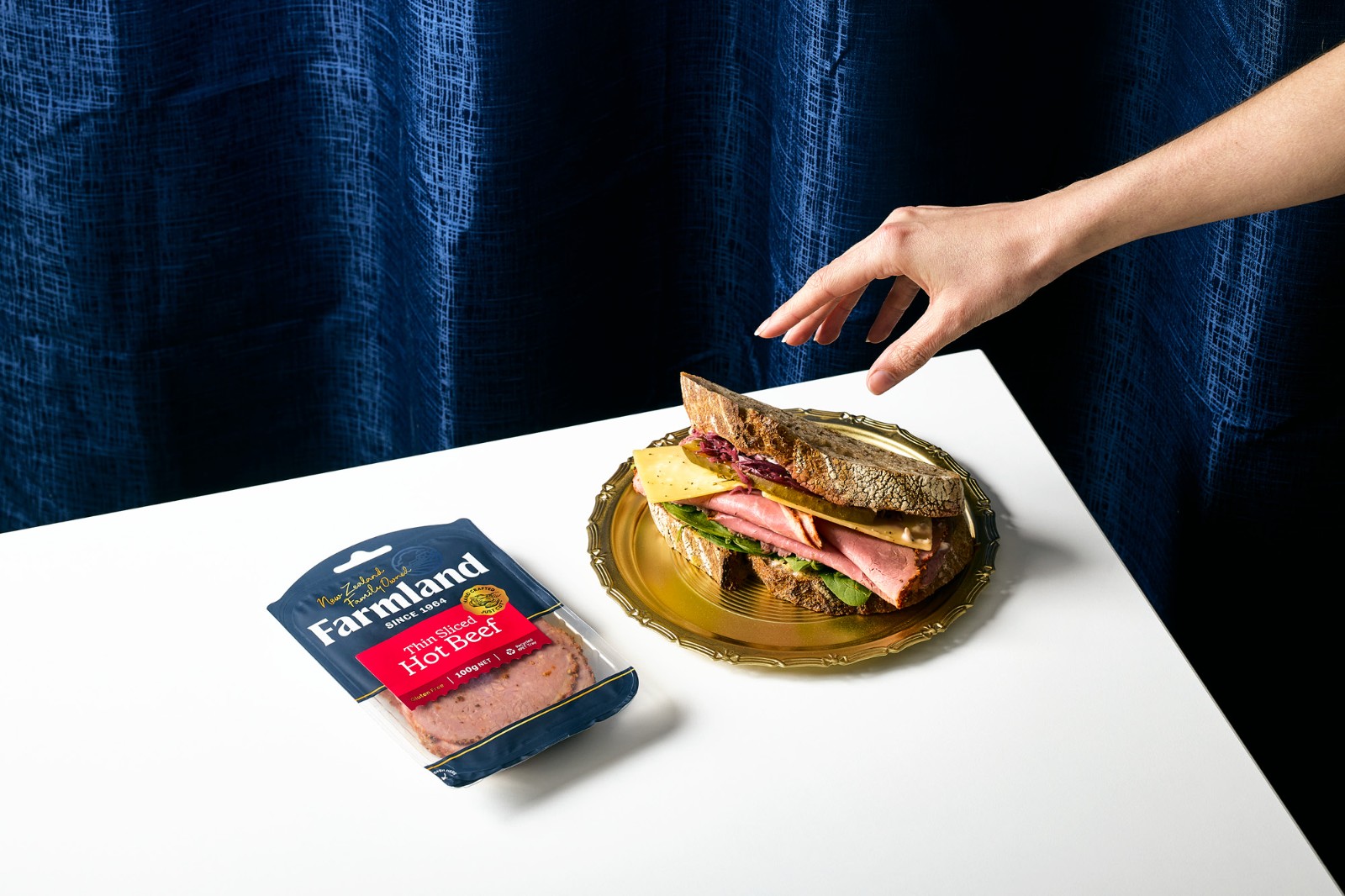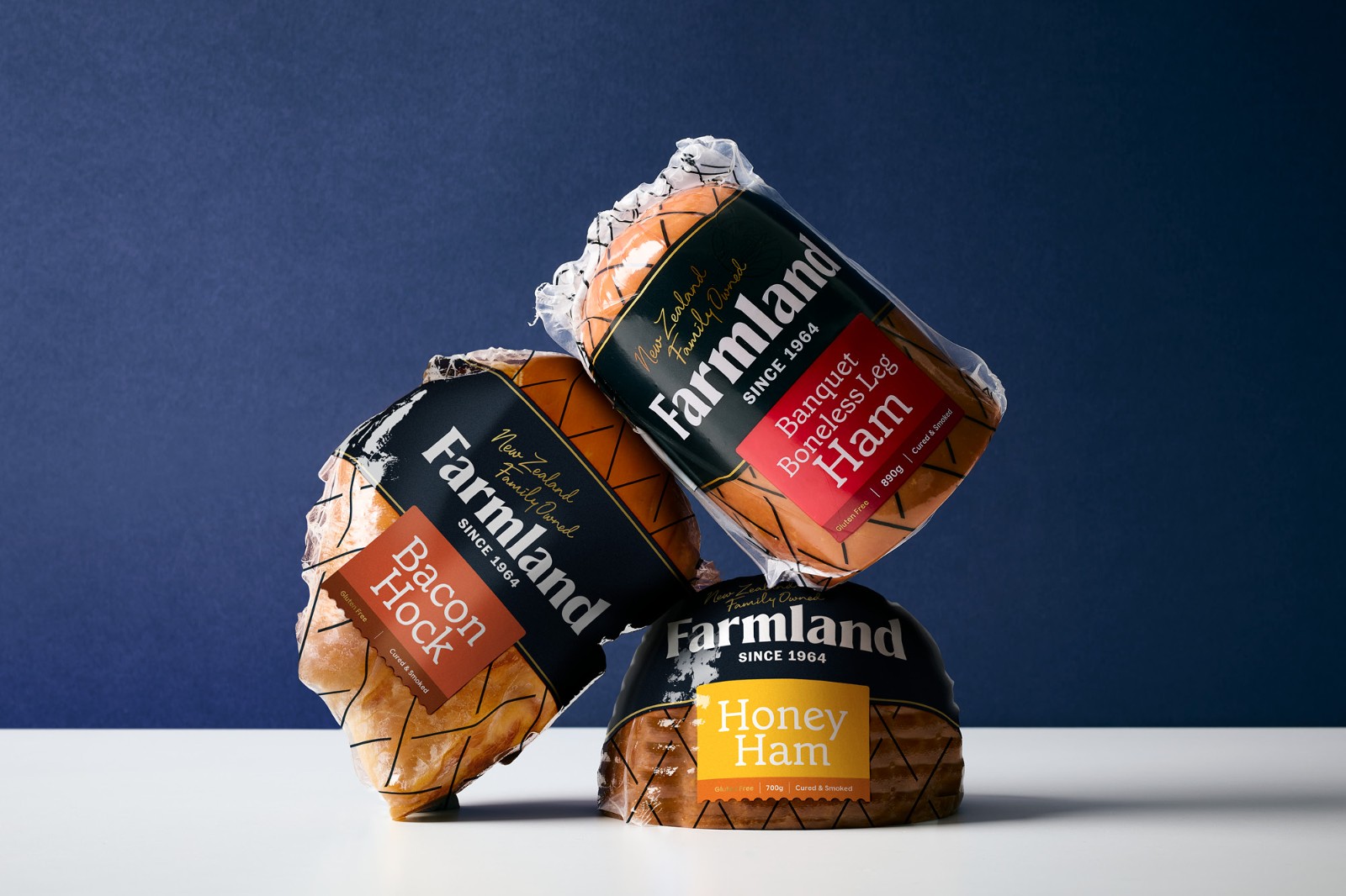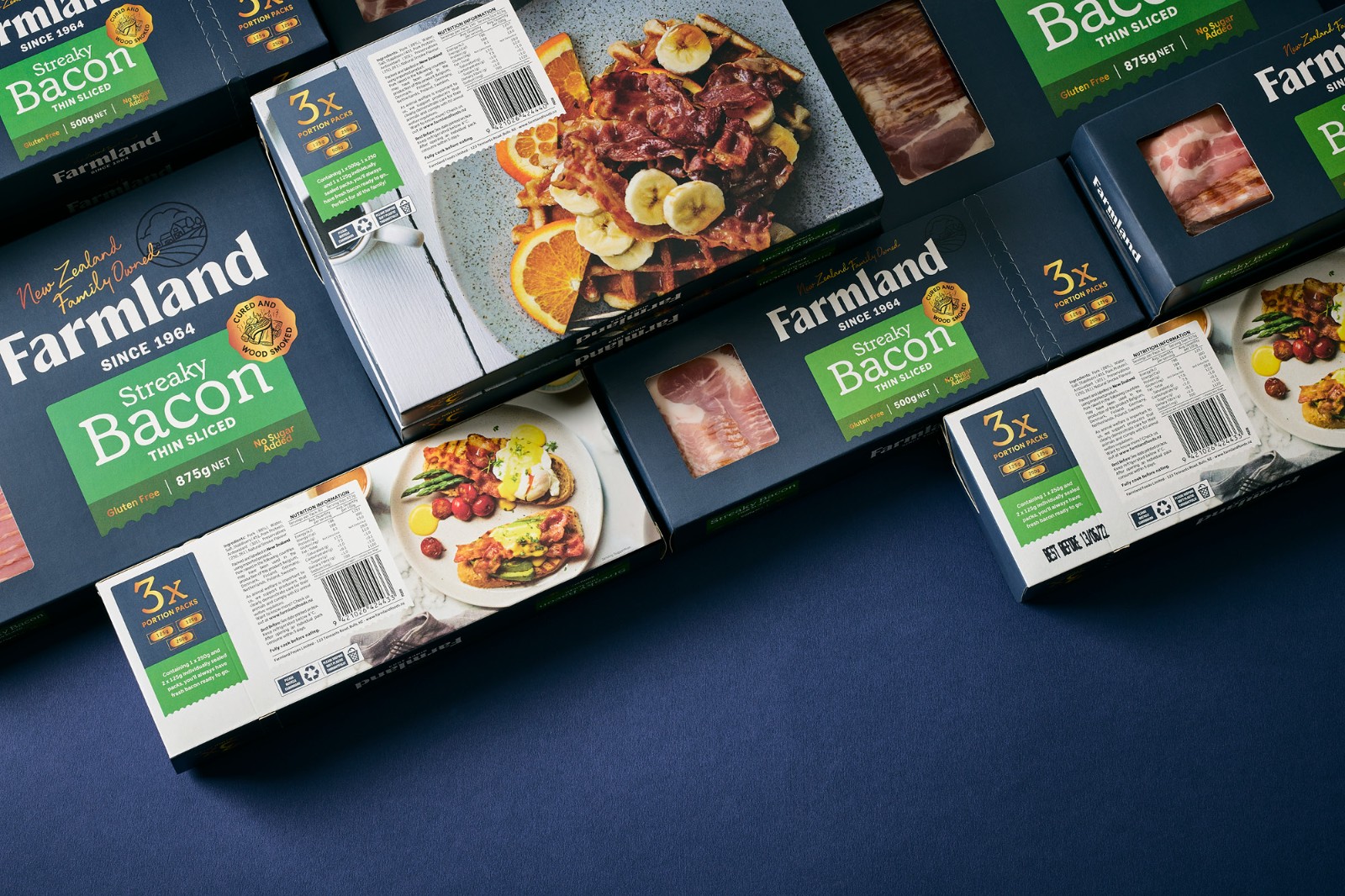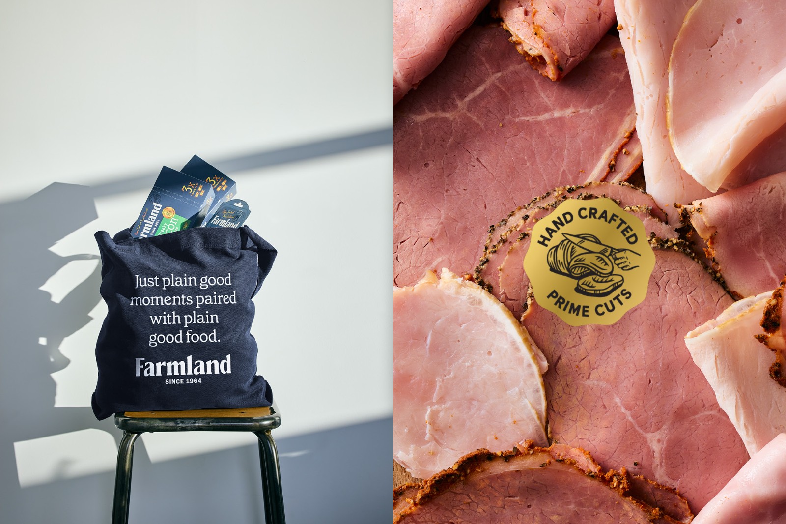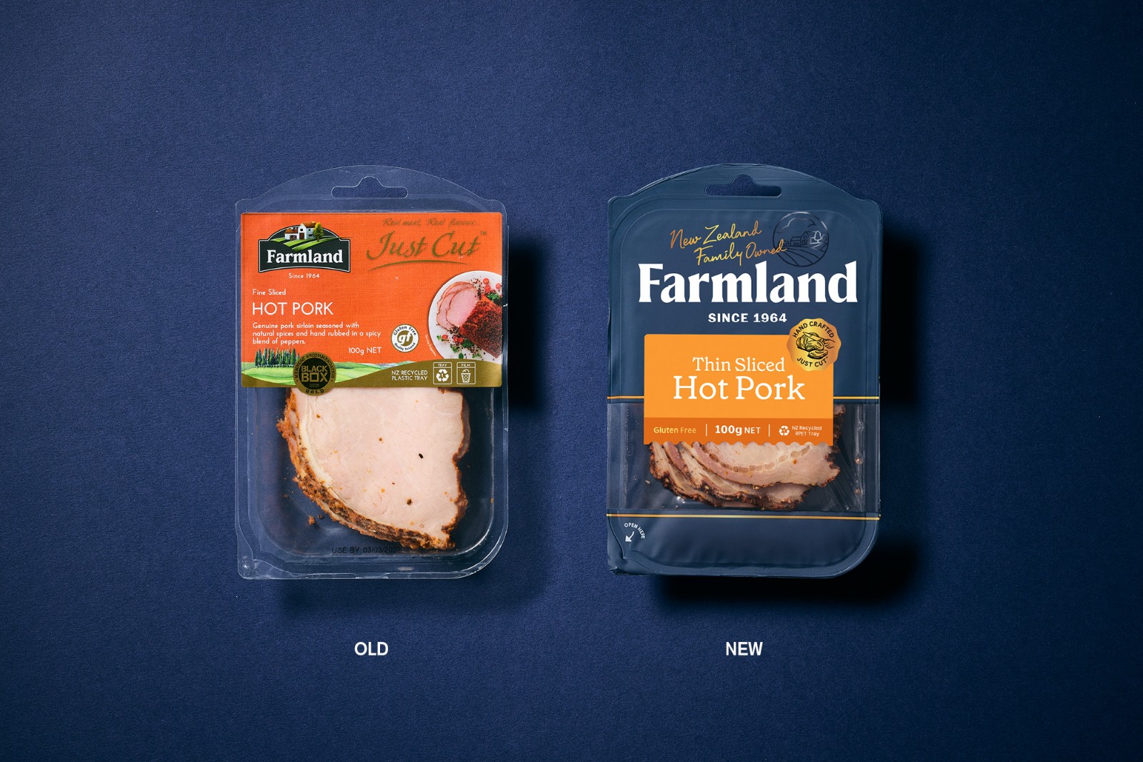 的謙遜簡約和對他們制造的產(chǎn)品的純粹自豪感來說明這一意圖。Farmland 的產(chǎn)品范圍從日常肉片、適合社交奶酪板的切塊到供全家食用的肉類。這些產(chǎn)品的碎片化造成了混亂的品牌形象,在某些情況下,品牌是如此之小以至于難以辨認它來自何方。與其價格點的競爭對手相比,品牌屏蔽幾乎不存在。整個產(chǎn)品組合發(fā)生了巨大的變化,從家族企業(yè)檔案中的攝影和圖像目錄中獲取線索。直接取自傳統(tǒng)屠夫圍裙的豐富單調(diào)海軍藍應(yīng)用于整個產(chǎn)品組合,為了進一步增強這種顏色的影響,沒有使用會阻礙或分散色塊效果的食物攝影。應(yīng)用于整個產(chǎn)品組合——與使用全彩印刷的競爭對手相比,這在所有類別領(lǐng)域創(chuàng)造了一個獨特而突出的品牌塊。
