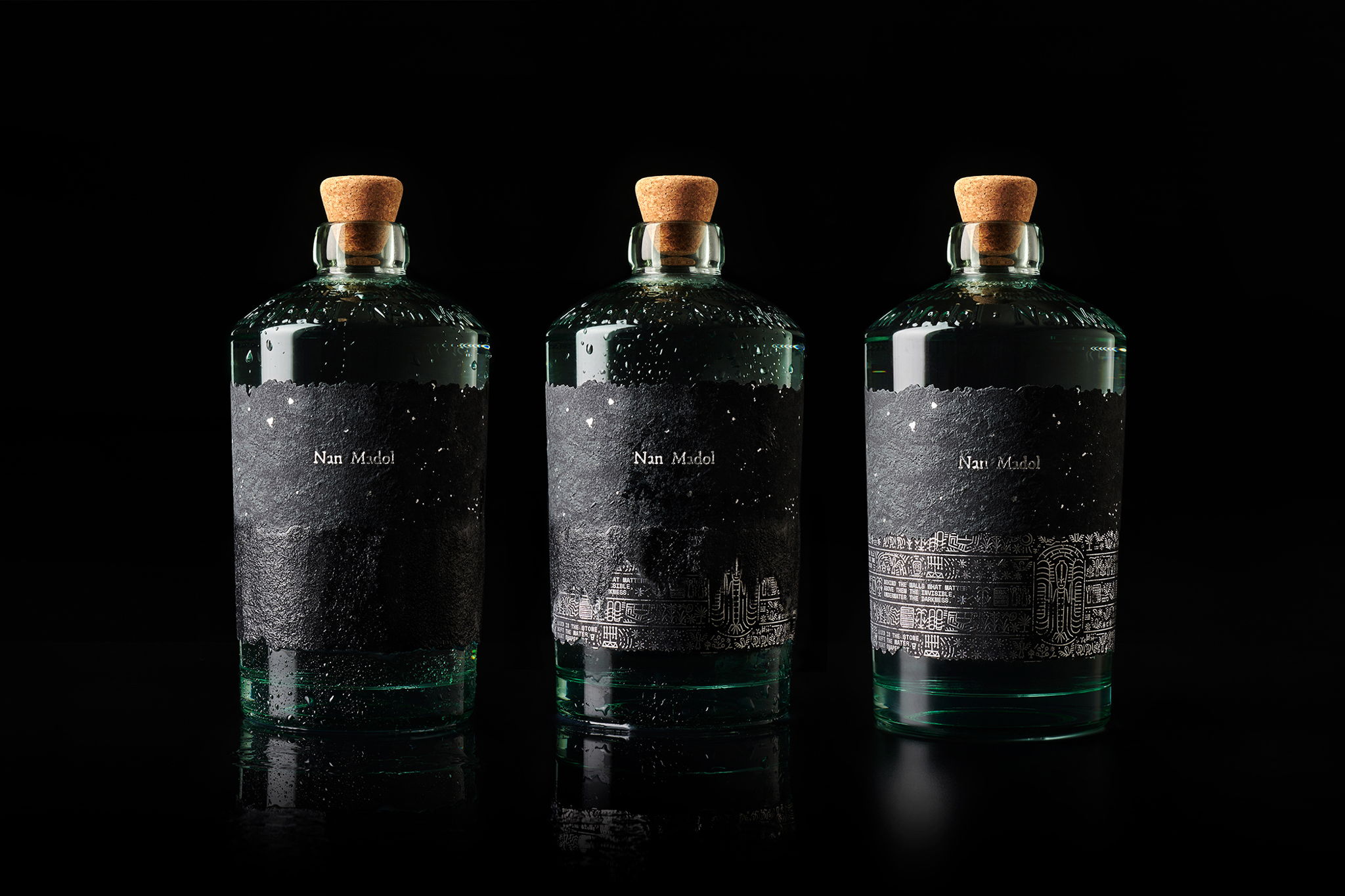 Nan Madol 的瓶子強(qiáng)調(diào)感官體驗(yàn)。由 Estudio Maba 設(shè)計(jì),瓶子的標(biāo)簽呈現(xiàn)為半浸沒(méi)狀態(tài),展示了水對(duì)石頭的影響。使用的材料、可溶解的紙、再生玻璃和紋理玻璃,繼續(xù)增加感官體驗(yàn),創(chuàng)造出一個(gè)神秘的瓶子,同時(shí)讓人感覺(jué)高貴和突出。
