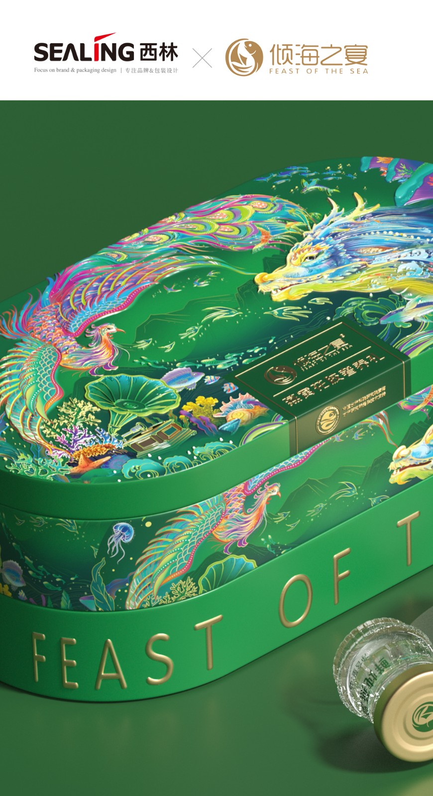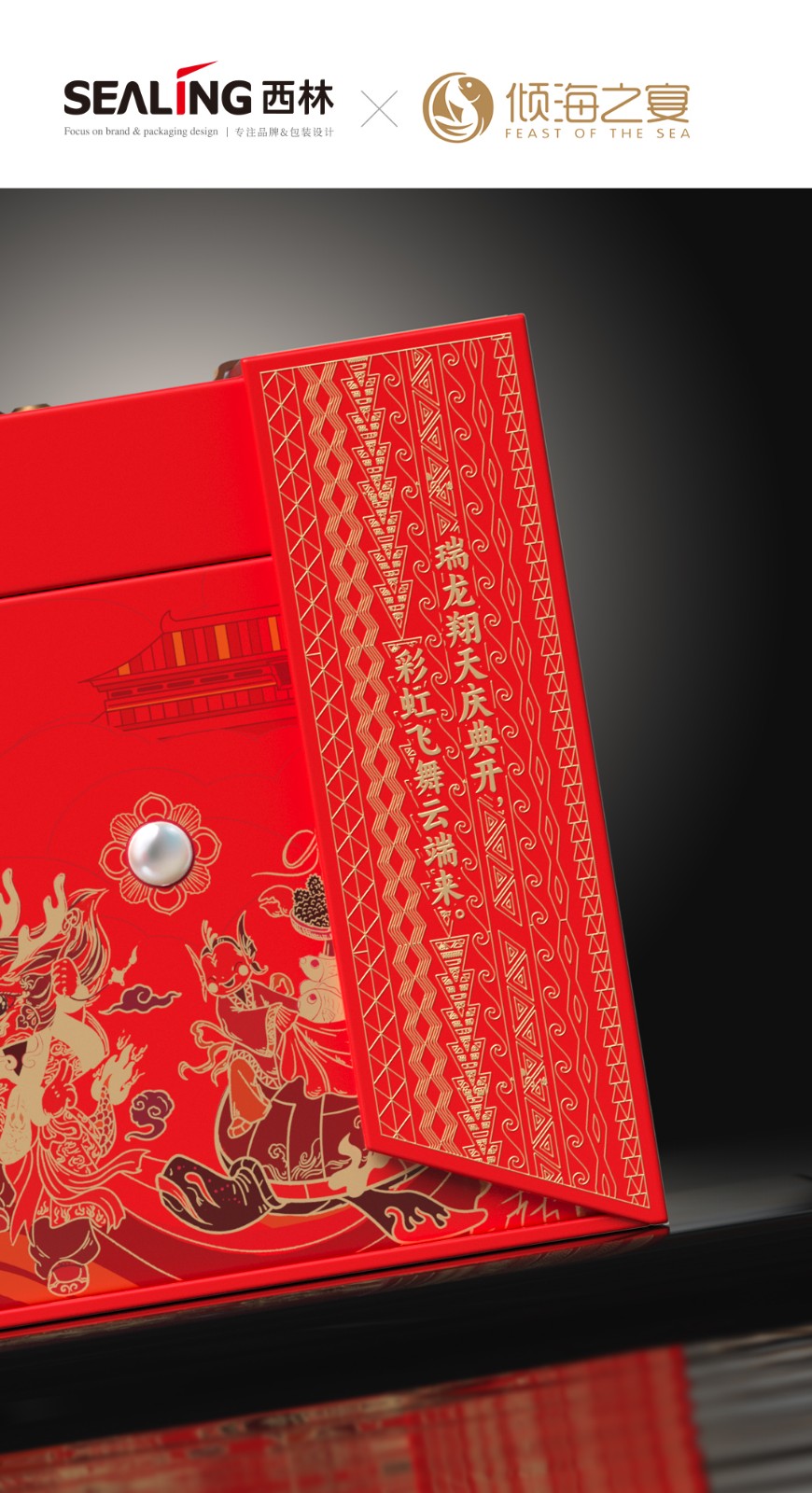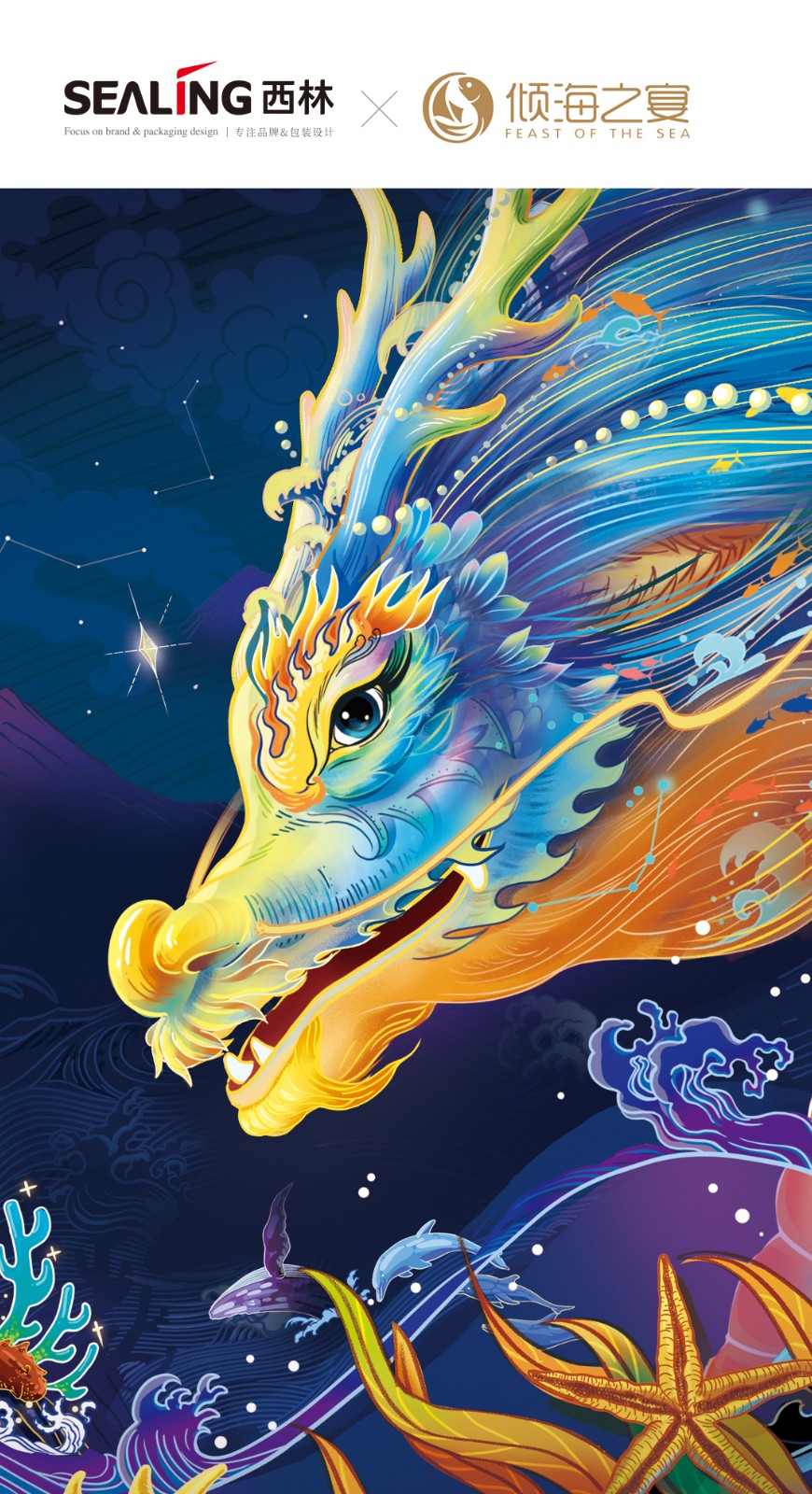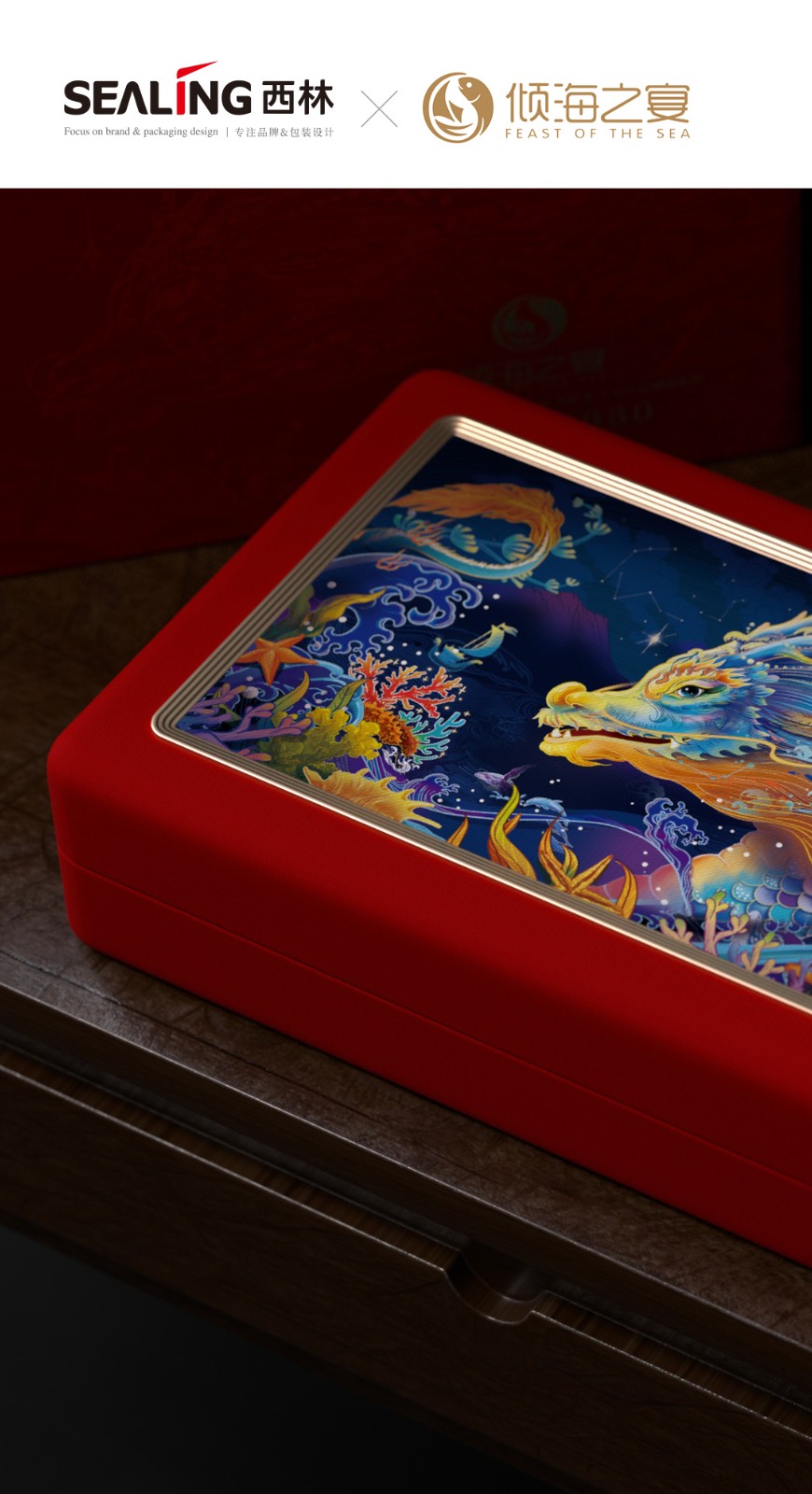近兩年來,西林設(shè)計(jì)為傾海之宴打造的“傾海龍”超級(jí)符號(hào),被廣泛應(yīng)用在視覺傳播的種個(gè)節(jié)點(diǎn)上,從產(chǎn)品包裝、宣傳物料、展會(huì)、新品發(fā)布會(huì)等等,形成了良好的視覺印象,也是傾海之宴禮盒包裝設(shè)計(jì)的核心元素,它不僅具有強(qiáng)烈的視覺沖擊力,還承載著深厚的文化內(nèi)涵。在設(shè)計(jì)中,龍成為了這一符號(hào)的代表,這一選擇并非偶然。龍,作為中國(guó)傳統(tǒng)文化的象征,代表著力量、尊貴與吉祥,中華人都是龍的傳人。在包裝上使用龍作為超級(jí)符號(hào),能夠迅速吸引消費(fèi)者的眼球,并在情感上產(chǎn)生共鳴。這種情感鏈接有助于增強(qiáng)消費(fèi)者對(duì)產(chǎn)品的好感,從而提高產(chǎn)品的附加值和市場(chǎng)競(jìng)爭(zhēng)力。