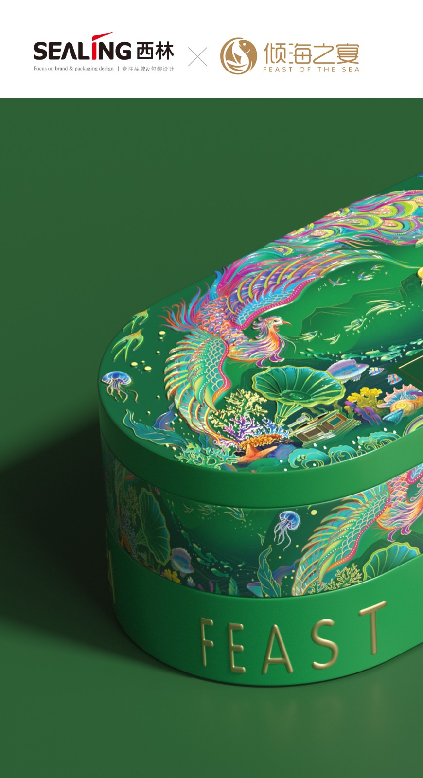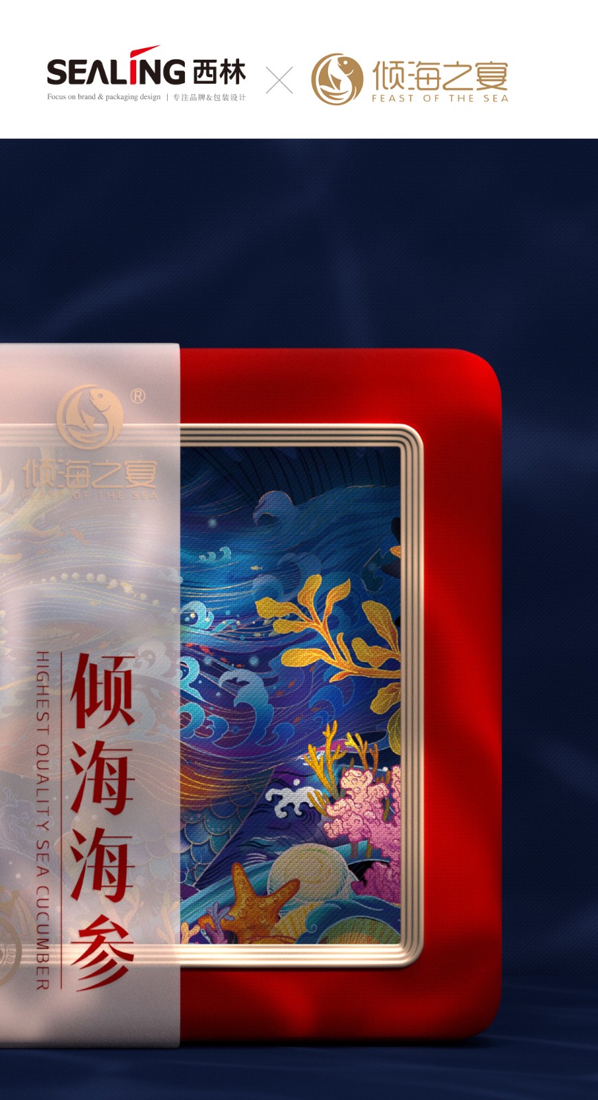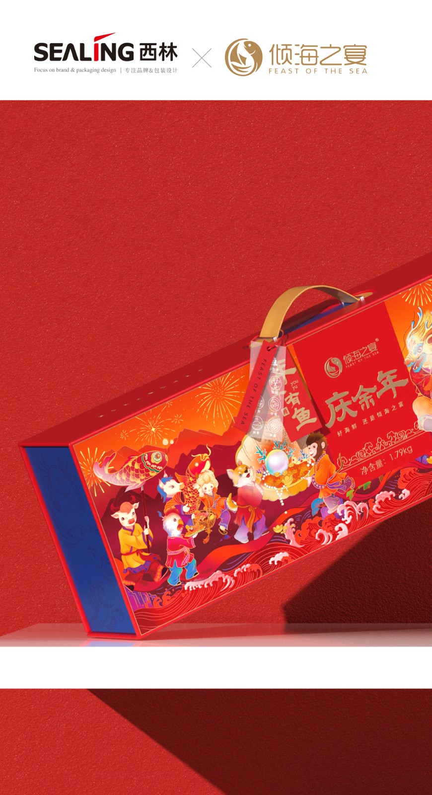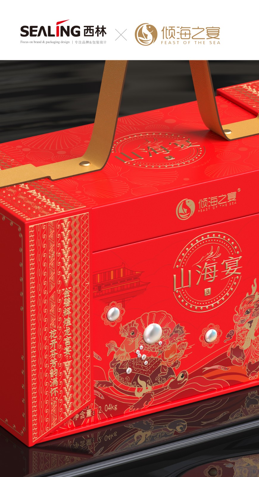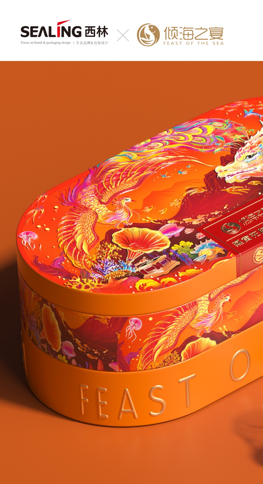 近兩年來,西林設(shè)計(jì)為傾海之宴打造的“傾海龍”超級(jí)符號(hào),被廣泛應(yīng)用在視覺傳播的種個(gè)節(jié)點(diǎn)上,從產(chǎn)品包裝、宣傳物料、展會(huì)、新品發(fā)布會(huì)等等,形成了良好的視覺印象,也是傾海之宴禮盒包裝設(shè)計(jì)的核心元素,它不僅具有強(qiáng)烈的視覺沖擊力,還承載著深厚的文化內(nèi)涵。在設(shè)計(jì)中,龍成為了這一符號(hào)的代表,這一選擇并非偶然。龍,作為中國(guó)傳統(tǒng)文化的象征,代表著力量、尊貴與吉祥,中華人都是龍的傳人。在包裝上使用龍作為超級(jí)符號(hào),能夠迅速吸引消費(fèi)者的眼球,并在情感上產(chǎn)生共鳴。這種情感鏈接有助于增強(qiáng)消費(fèi)者對(duì)產(chǎn)品的好感,從而提高產(chǎn)品的附加值和市場(chǎng)競(jìng)爭(zhēng)力。