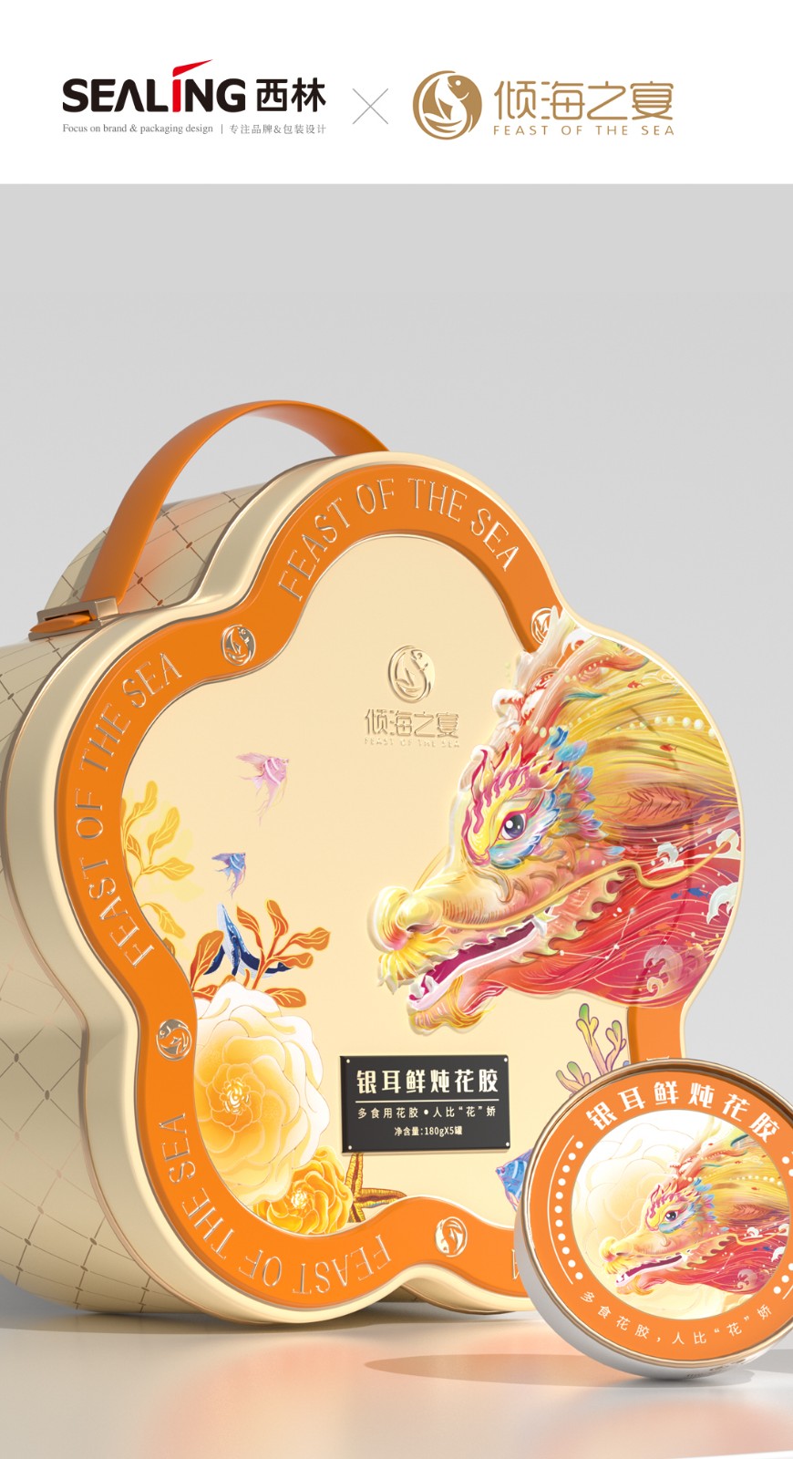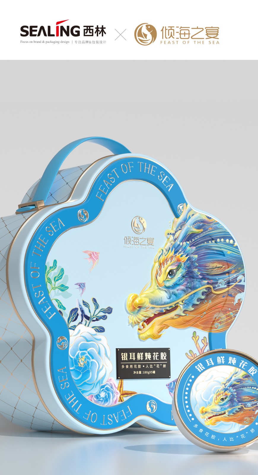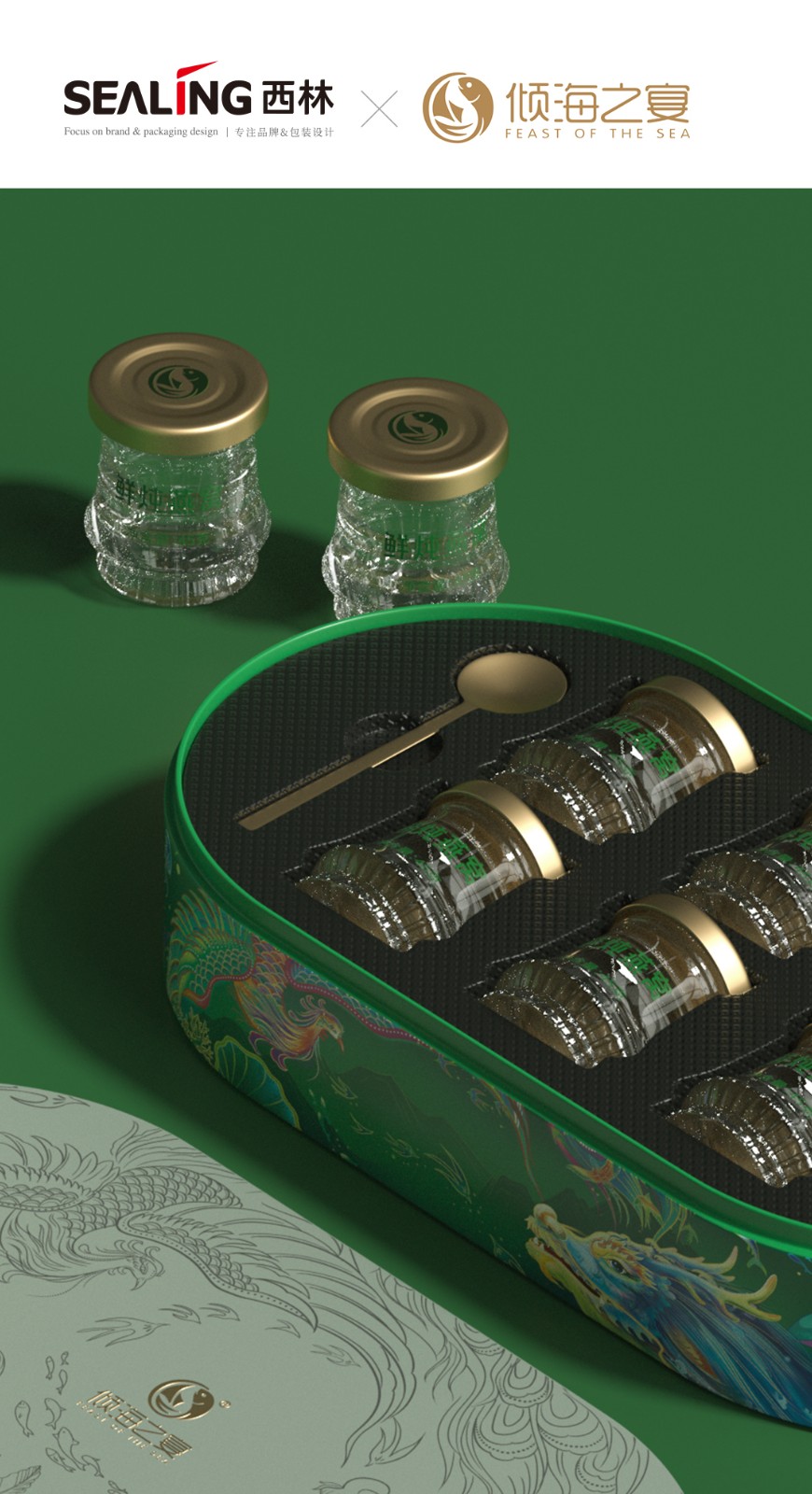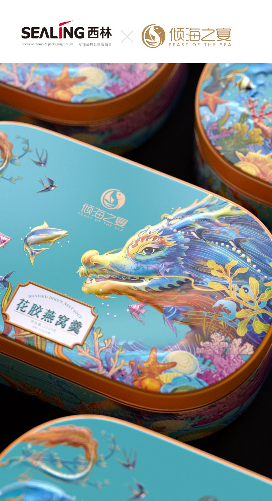龍年來臨之際,西林設(shè)計(jì)助力傾海之宴品牌推出了全新的禮盒,包裝設(shè)計(jì)設(shè)計(jì)融入了濃厚的龍年元素和吉祥寓意,完美地展現(xiàn)了東方的美學(xué)理念,將禮盒的檔次提升到了一個(gè)新的高度。燕窩花膠奢養(yǎng)禮盒的包裝設(shè)計(jì)旨在展現(xiàn)產(chǎn)品的尊貴品質(zhì),同時(shí)融入了中國(guó)傳統(tǒng)文化元素和海洋生態(tài)元素,呈現(xiàn)出精致、創(chuàng)意和奢華的風(fēng)格。西林設(shè)計(jì)為這款禮盒采用高品質(zhì)的馬口鐵盒作為外包裝,具有堅(jiān)固、耐用的特點(diǎn),能夠有效地保護(hù)內(nèi)部產(chǎn)品。馬口鐵盒的外觀采用質(zhì)感多色系列,給人一種時(shí)尚、高貴、典雅的感覺。
