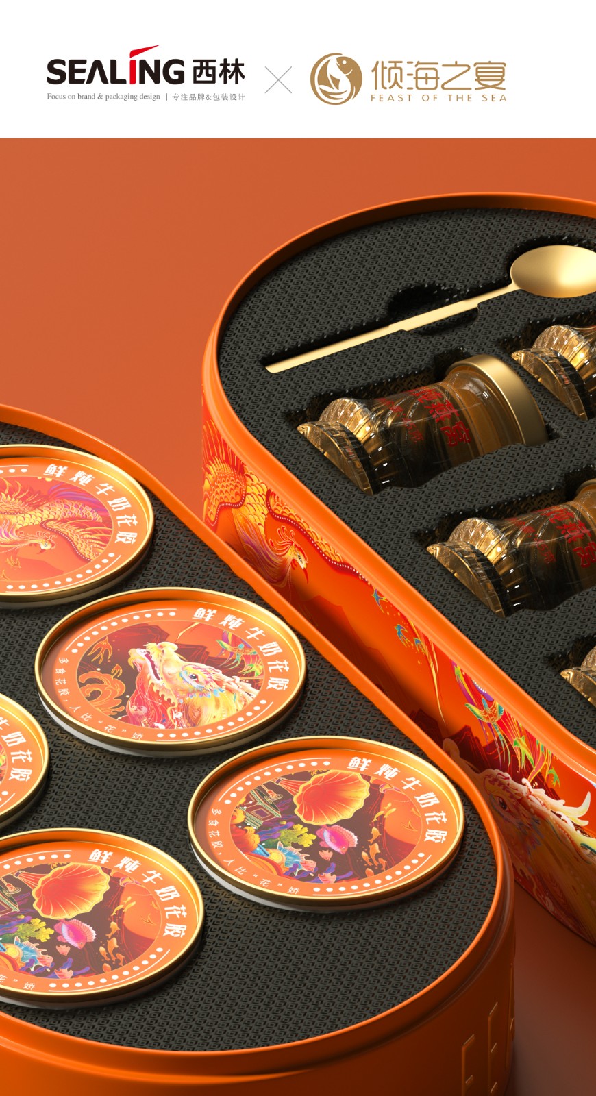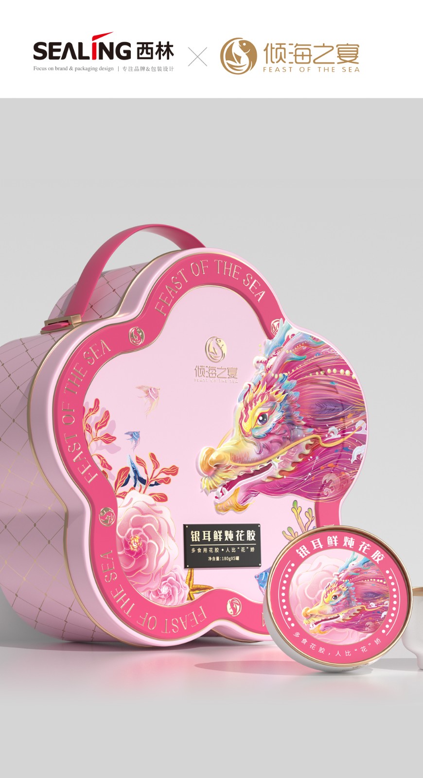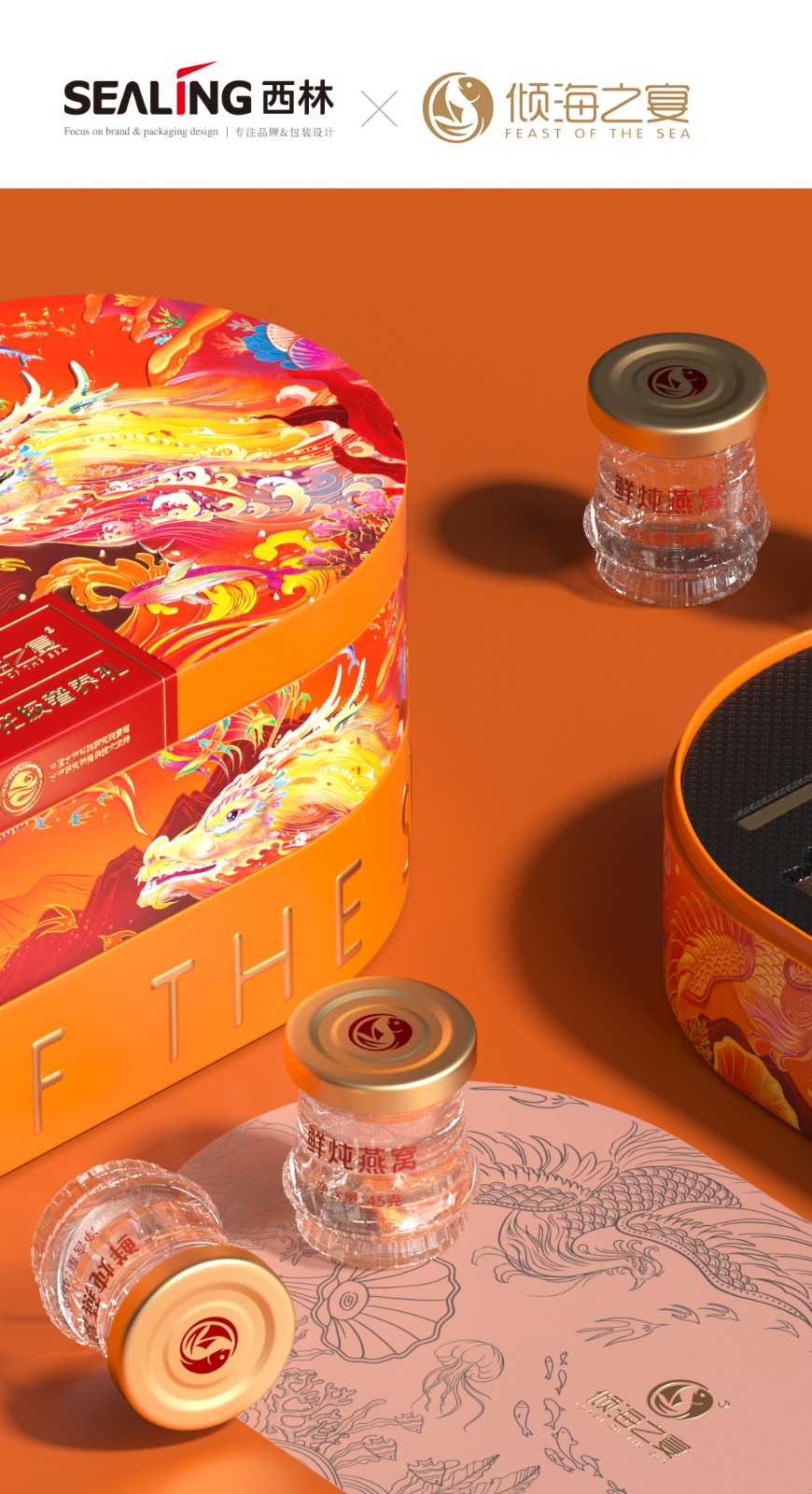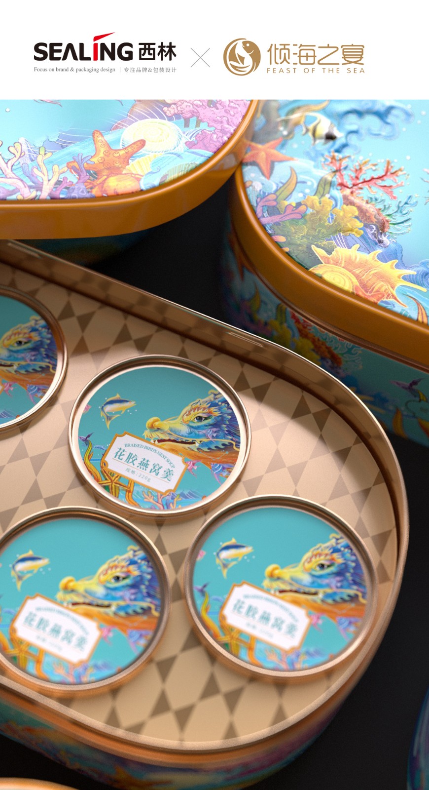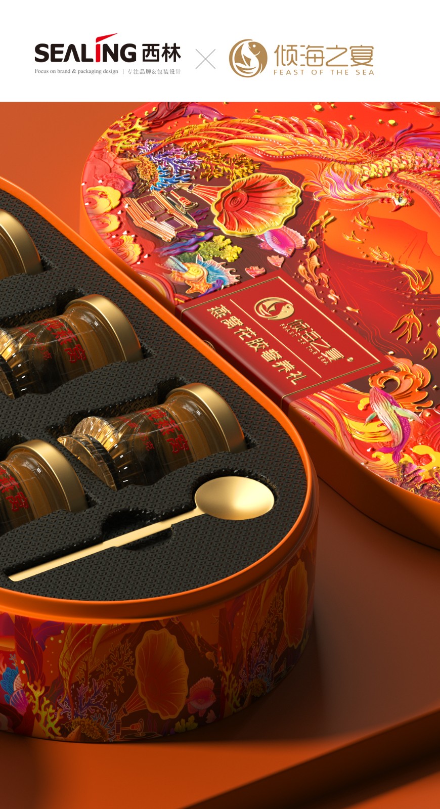 龍年來臨之際,西林設(shè)計(jì)助力傾海之宴品牌推出了全新的禮盒,包裝設(shè)計(jì)設(shè)計(jì)融入了濃厚的龍年元素和吉祥寓意,完美地展現(xiàn)了東方的美學(xué)理念,將禮盒的檔次提升到了一個(gè)新的高度。燕窩花膠奢養(yǎng)禮盒的包裝設(shè)計(jì)旨在展現(xiàn)產(chǎn)品的尊貴品質(zhì),同時(shí)融入了中國(guó)傳統(tǒng)文化元素和海洋生態(tài)元素,呈現(xiàn)出精致、創(chuàng)意和奢華的風(fēng)格。西林設(shè)計(jì)為這款禮盒采用高品質(zhì)的馬口鐵盒作為外包裝,具有堅(jiān)固、耐用的特點(diǎn),能夠有效地保護(hù)內(nèi)部產(chǎn)品。馬口鐵盒的外觀采用質(zhì)感多色系列,給人一種時(shí)尚、高貴、典雅的感覺。