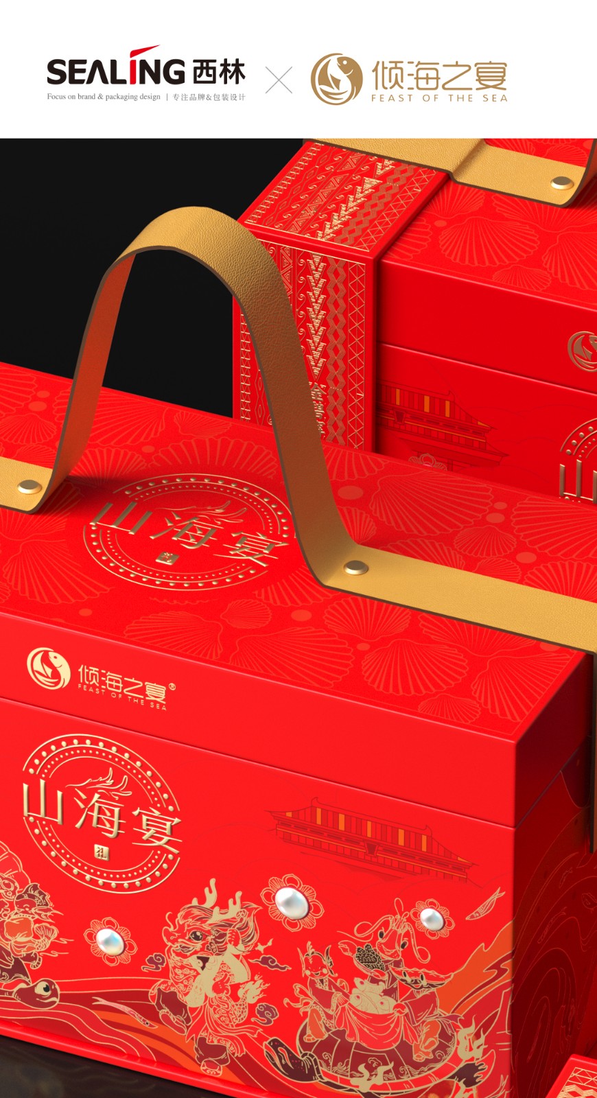 西林設(shè)計(jì)認(rèn)為包裝的功能性和用戶體驗(yàn)也是設(shè)計(jì)價(jià)值的重要體現(xiàn)。傾海之宴的禮盒包裝應(yīng)注重結(jié)構(gòu)穩(wěn)固、開盒體驗(yàn)等方面的設(shè)計(jì),以提高用戶體驗(yàn)儀式感。為了強(qiáng)化品牌形象,我們將在禮盒正前方設(shè)計(jì)一個(gè)精致的山海宴禮盒的專屬標(biāo)志。ICON采用立體金標(biāo),與紅色背景形成鮮明對(duì)比,易于識(shí)別。遵循簡(jiǎn)潔大方,既能突顯出品牌特色,又能提升禮盒的整體質(zhì)感,與插畫空間創(chuàng)意相得益彰。