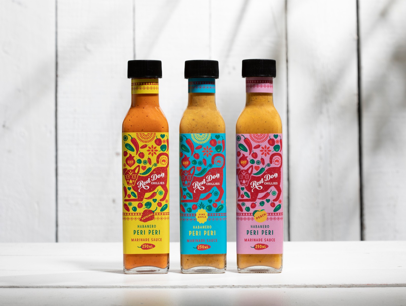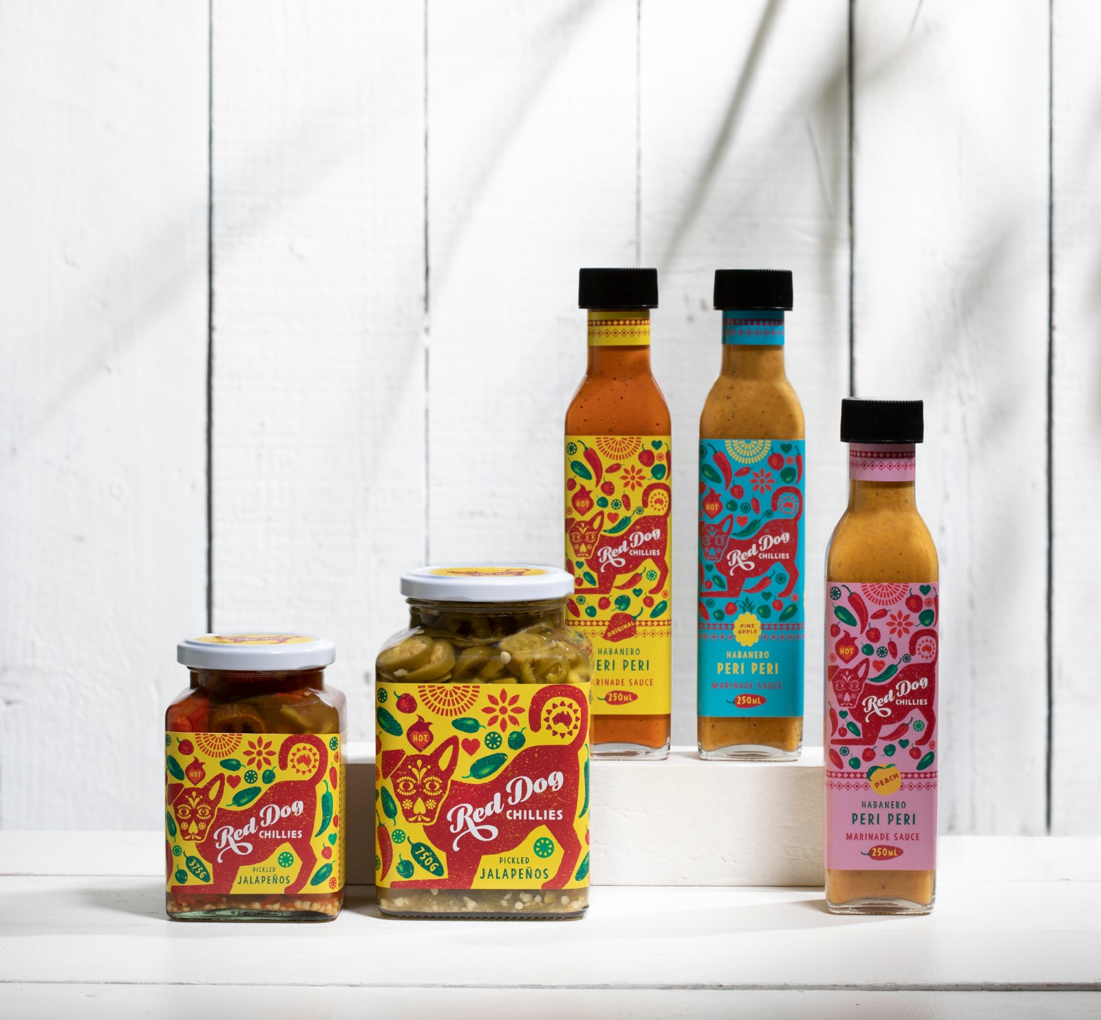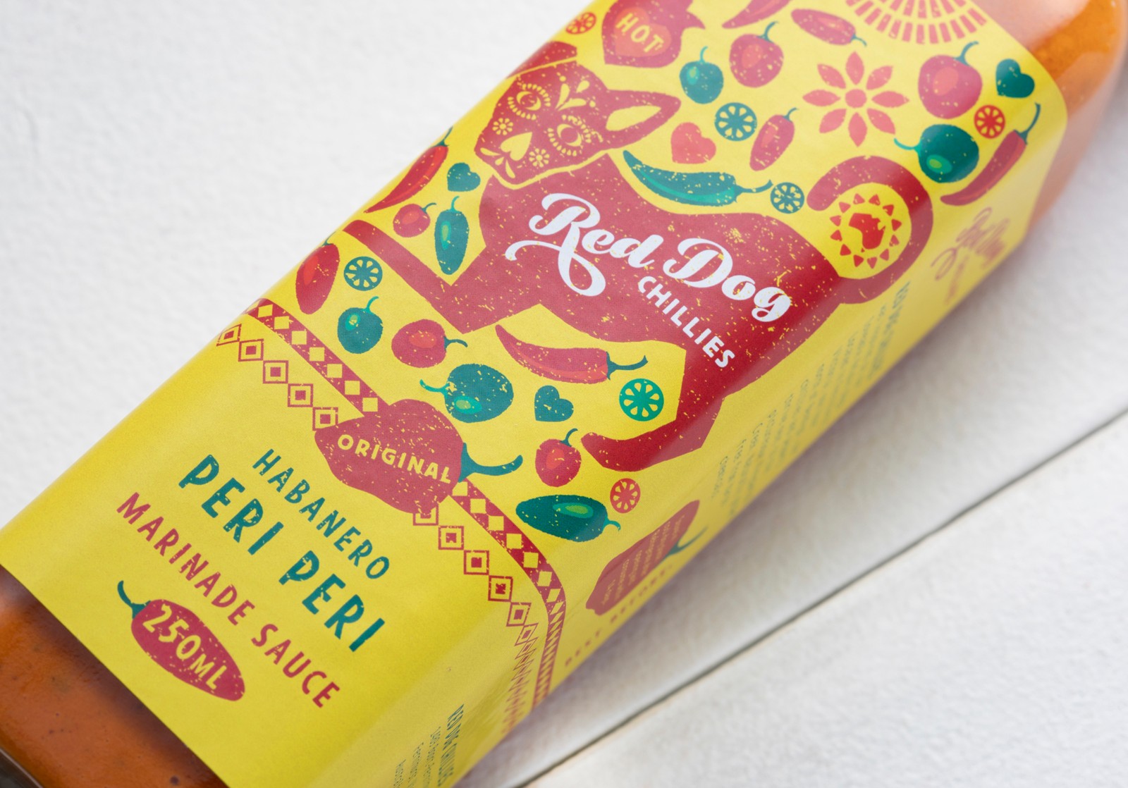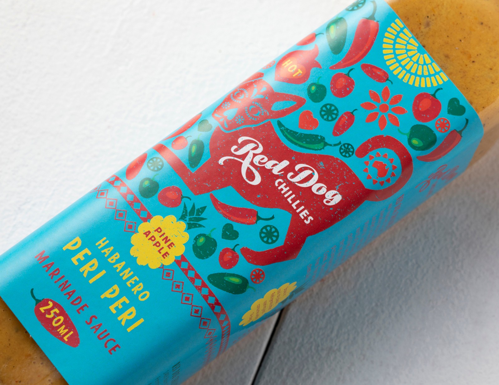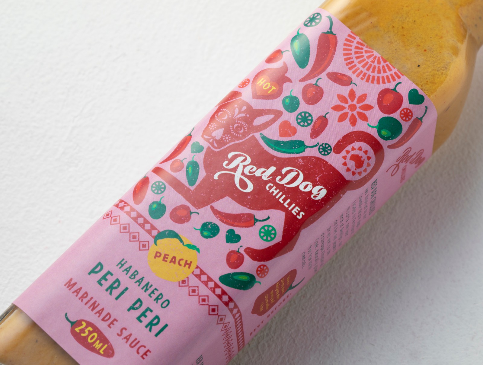 紅狗辣椒(Red Dog Chillies)需要重塑品牌,以展示其優(yōu)質(zhì)產(chǎn)品并吸引新的消費者興趣。他們的老品牌并沒有傳達(dá)出店內(nèi)真實,炙手可熱的美味。為了與墨西哥風(fēng)味的辣醬和墨西哥胡椒保持一致,我們采用了墨西哥的“街頭食品”主題。他們心愛的“紅狗”蜿蜒在農(nóng)場周圍,在標(biāo)簽上占據(jù)著中心位置。紅狗上裝飾著“死亡之日”口罩,標(biāo)簽上散布著許多品種的辣椒。該標(biāo)簽還有其他故事講述的圖像–太陽,這是辣椒成功生長的關(guān)鍵因素,并且以圖形方式傳達(dá)這是澳大利亞的產(chǎn)品。墨西哥設(shè)計模式增加了墨西哥主題。醬汁范圍內(nèi)共有三種口味,每種口味都有不同的顏色。