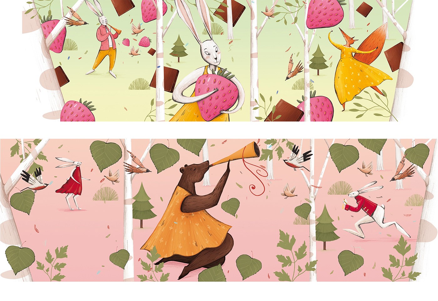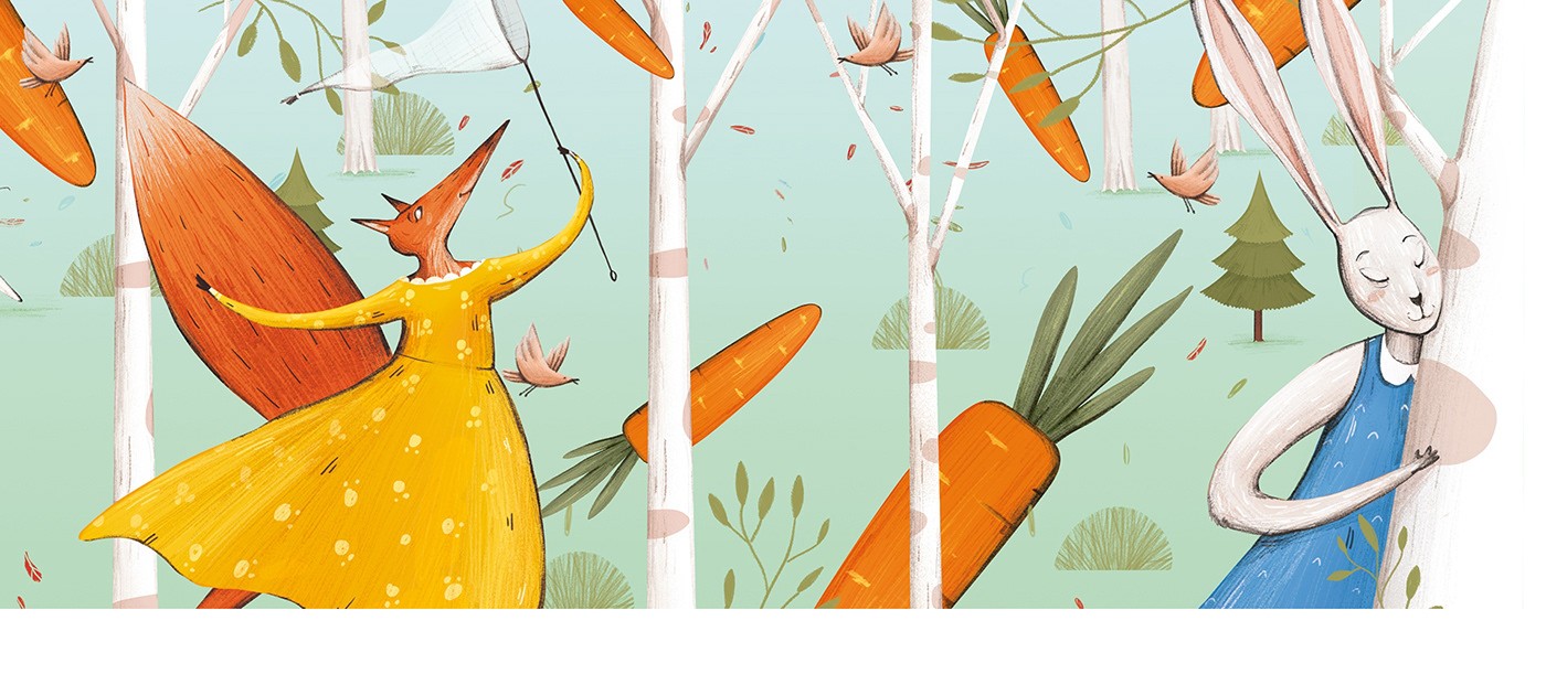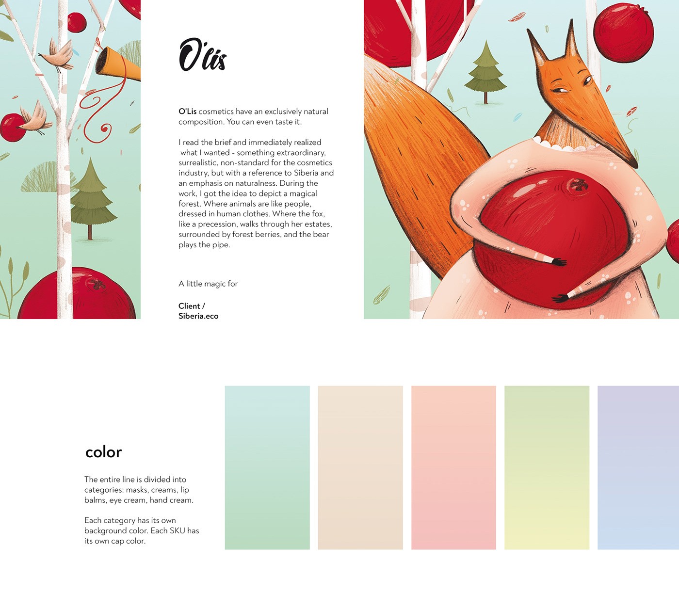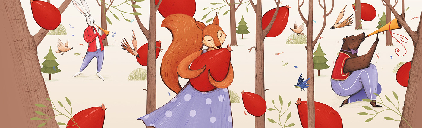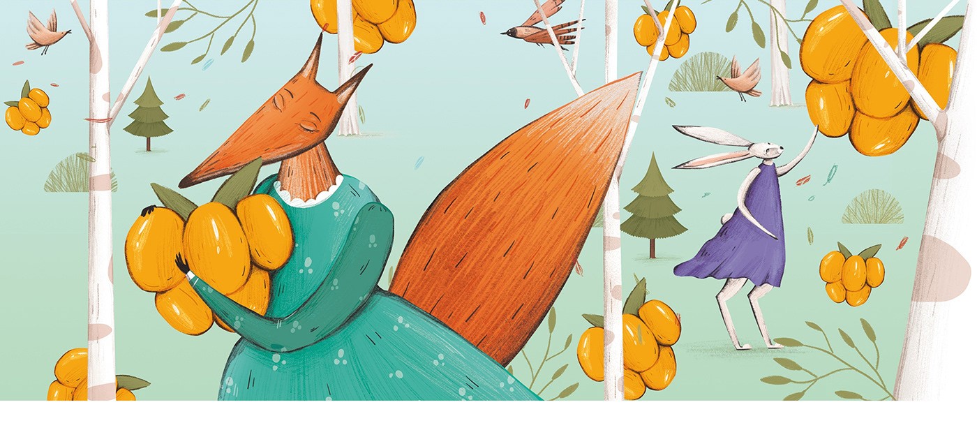 在這個(gè)設(shè)計(jì)項(xiàng)目中,我想到了要描繪一個(gè)神奇的森林。那里的動(dòng)物就像人一樣,穿著人類的衣服衣服。散步穿過(guò)她的莊園森林里有漿果,熊在吹笛。