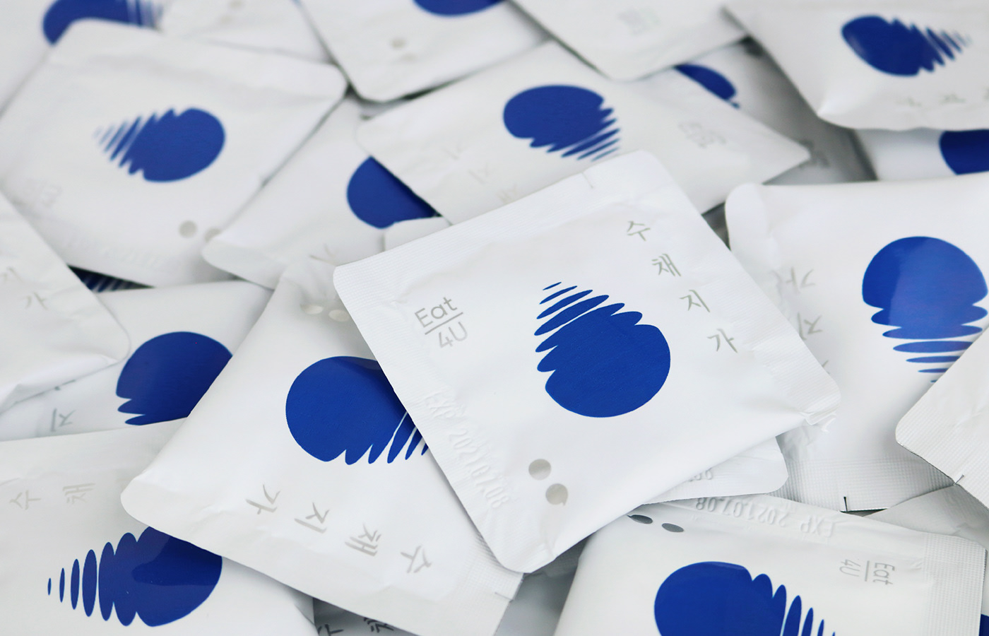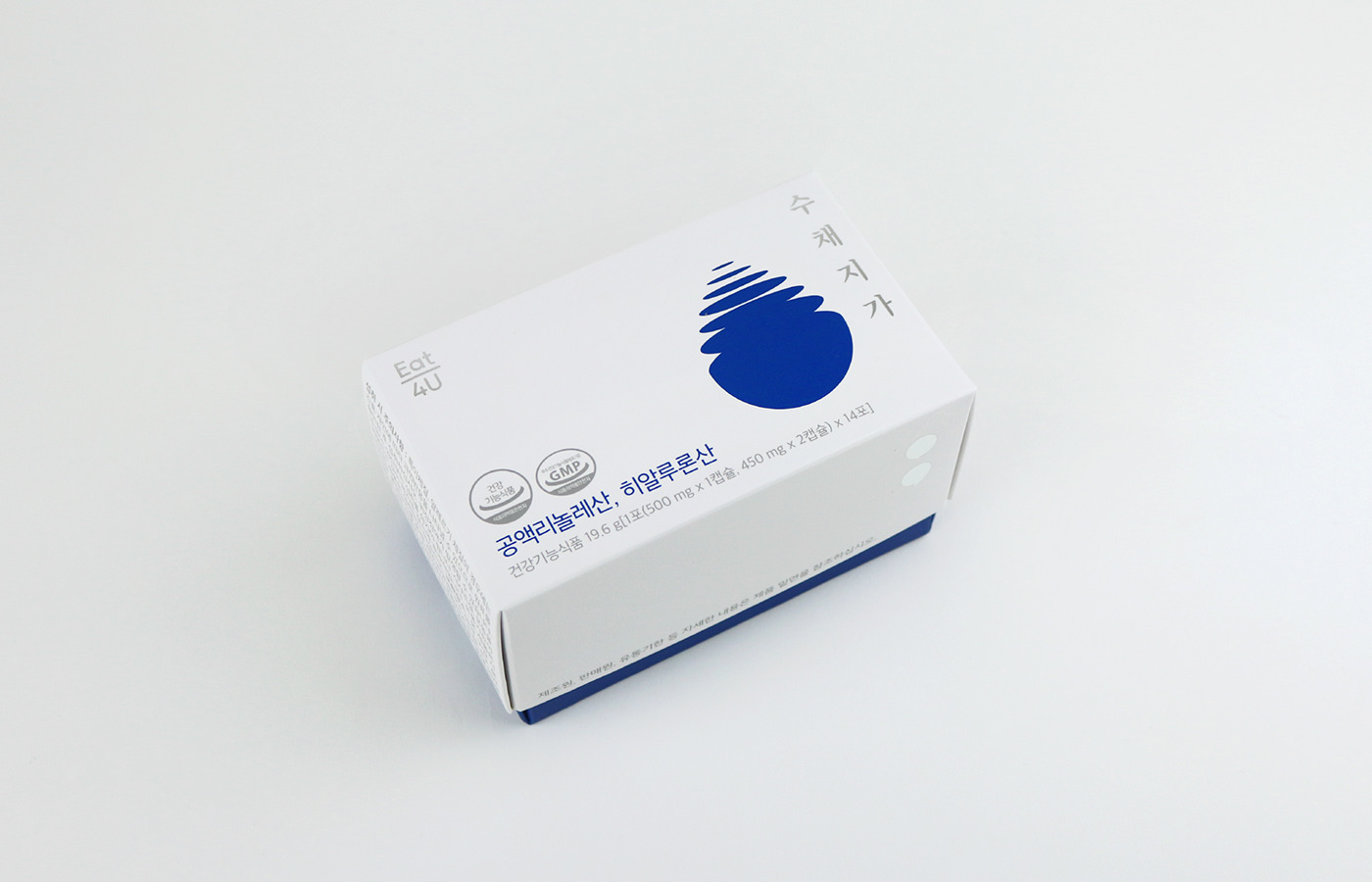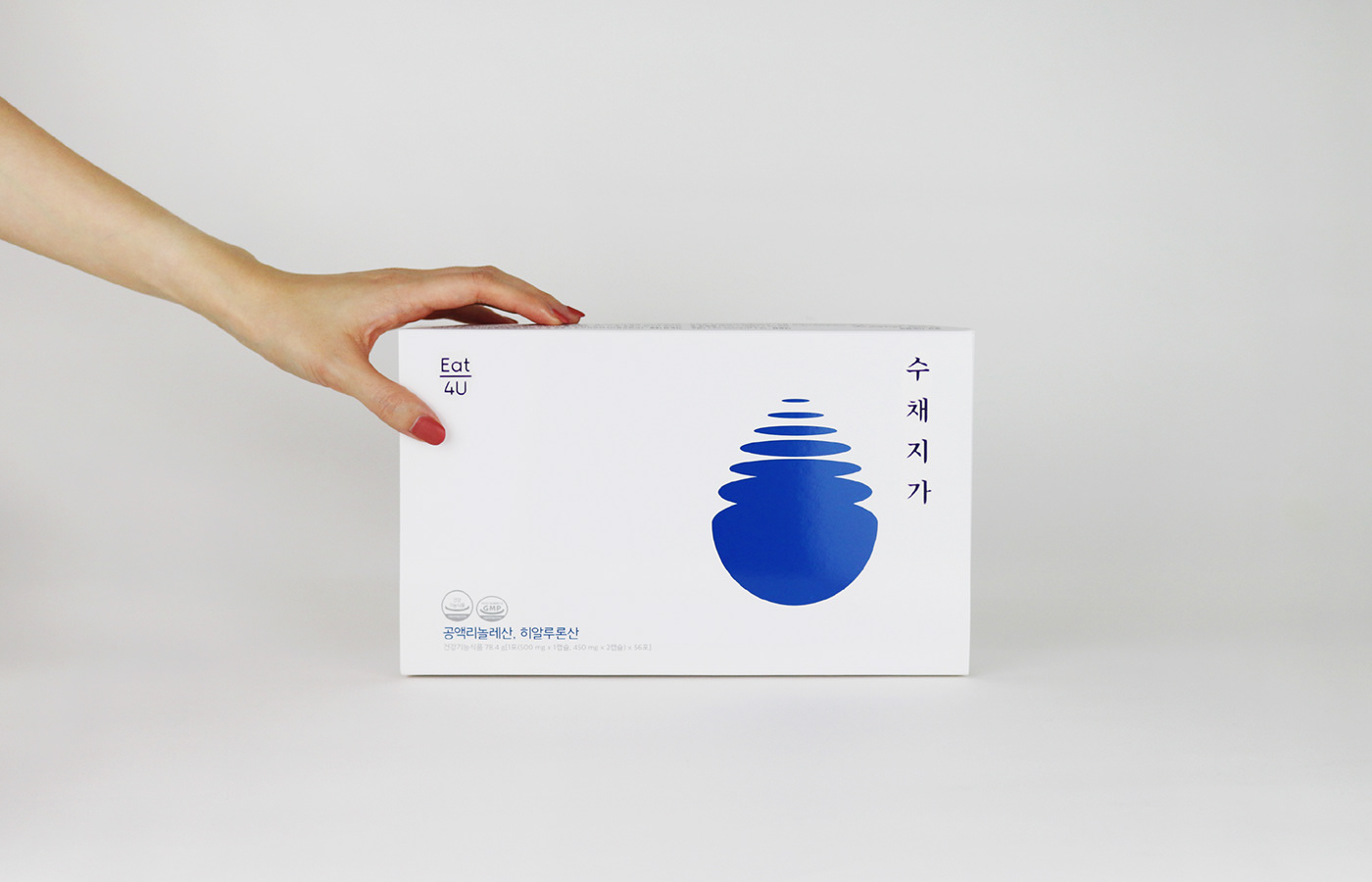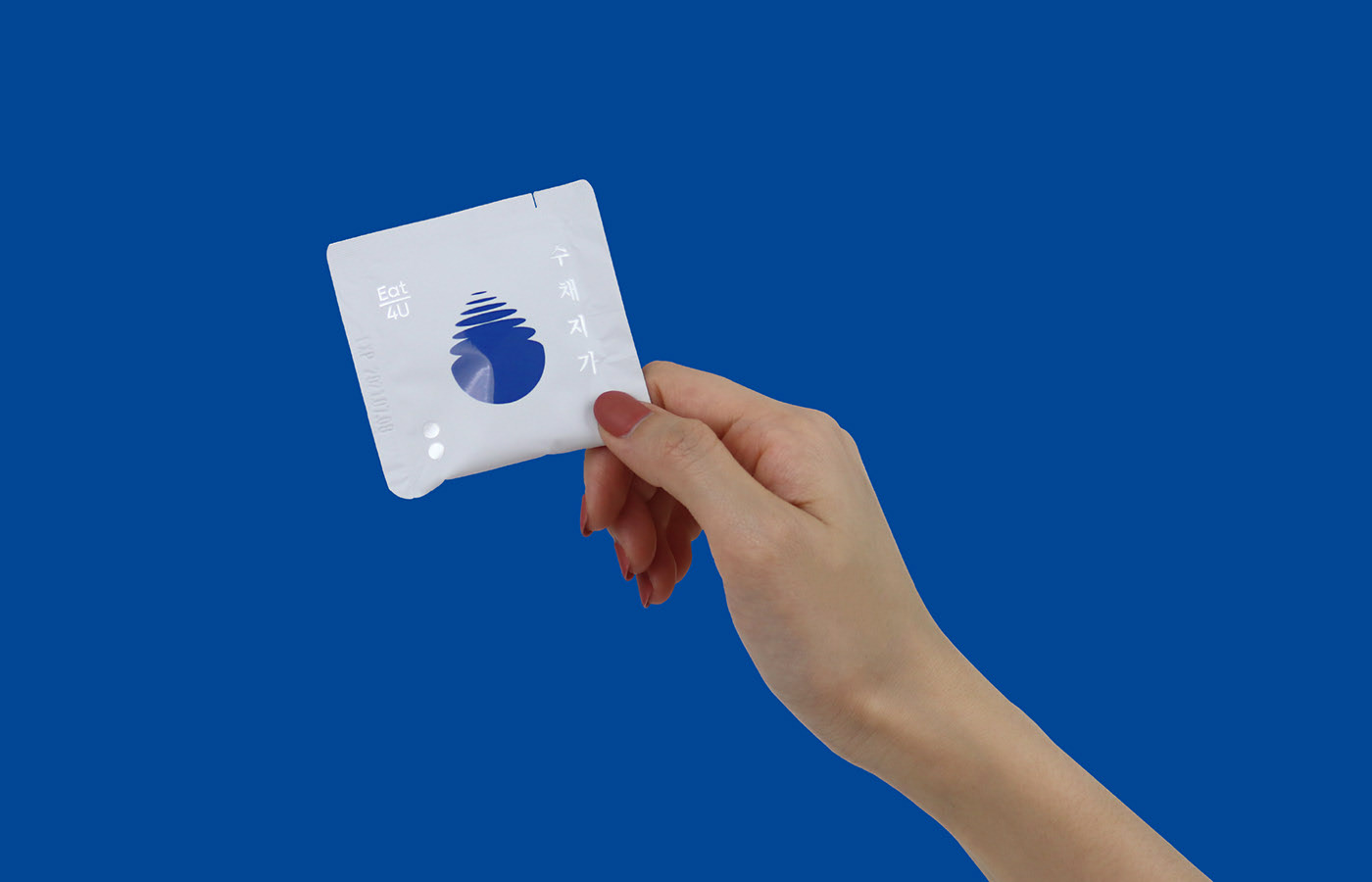 我們設(shè)計(jì)了'????'的包裝,這是一種來自Eat4U的新型健康功能食品,eat4u是一個(gè)致力于健康生活的品牌。'????',字面意思是“充滿水分,釋放脂肪”,是一種膳食補(bǔ)充劑,可以解決節(jié)食者每天攝入水分的困難。最重要的關(guān)鍵詞是“充滿水分”,我們打算通過包裝的圖形設(shè)計(jì)來視覺傳達(dá)充滿水分。由于“水分”是一個(gè)物理上比水小的概念,我們選擇使用水滴作為被填充的象征性表示。我們試圖通過一個(gè)完整的符號來傳達(dá)一個(gè)產(chǎn)品概念。