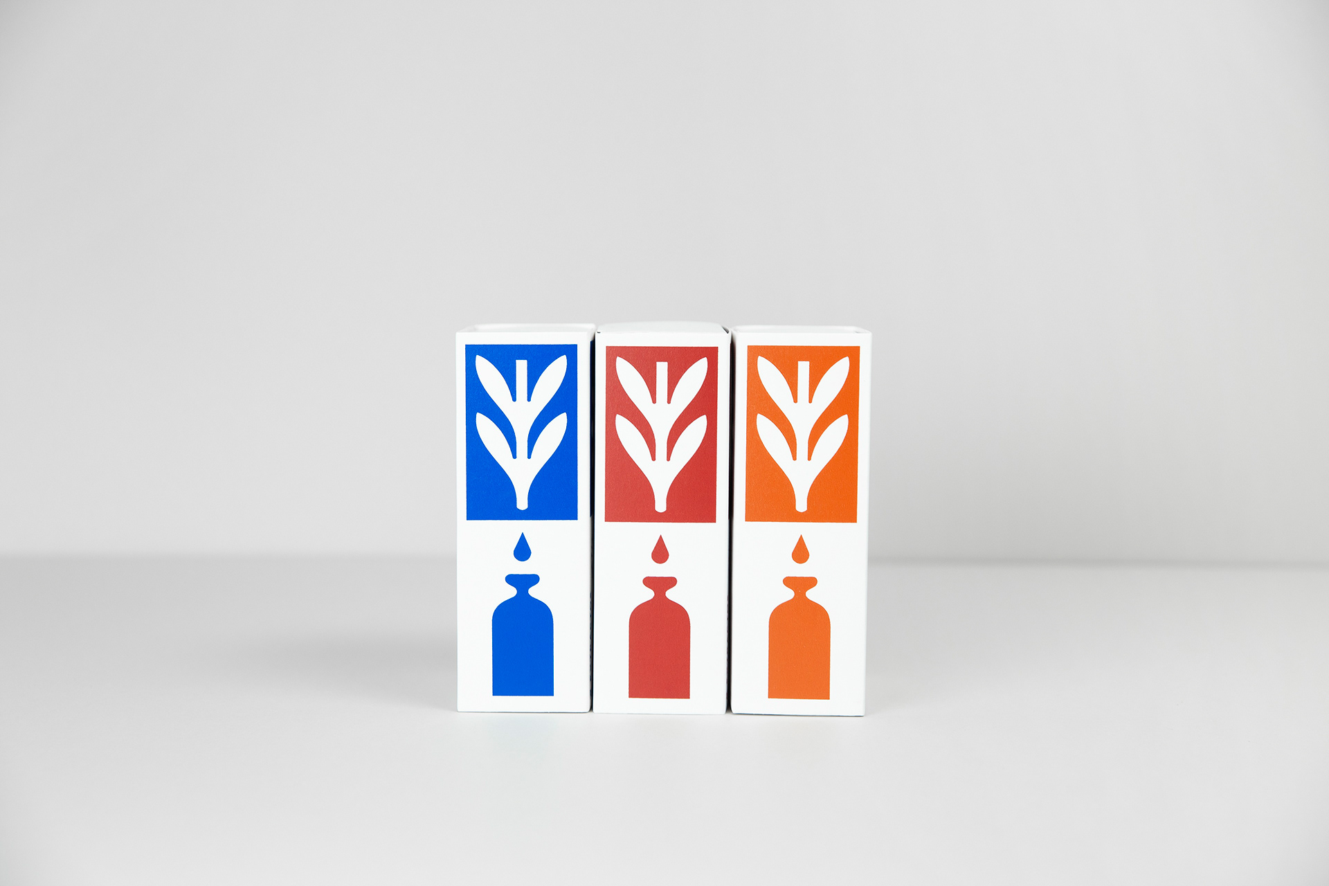藥用植物浸漬液是含有植物的活性和修復(fù)原理的水醇溶液。該產(chǎn)品線由作用于不同身體系統(tǒng)的12種植物組成。每種顏色標(biāo)識不同的系統(tǒng)。紅色代表循環(huán)系統(tǒng),藍(lán)色代表神經(jīng)系統(tǒng),橙色代表消化系統(tǒng)。從包裝的設(shè)計出發(fā),我們借鑒了普通藥物的美學(xué)并將其與植物世界聯(lián)系起來,從而將重點放在整個項目用1塊絲印絲網(wǎng)印刷。