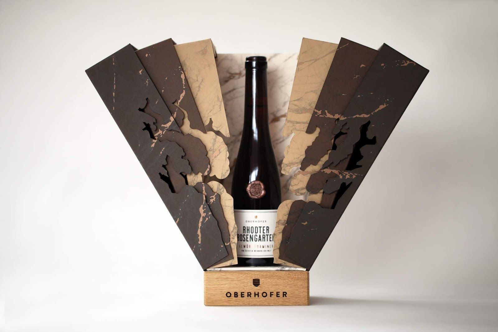 OBERHOFER德國紅酒包裝盒設(shè)計,外型似一顆樹,包裝的形狀與酒莊的葡萄園有關(guān),這款酒包裝設(shè)計的最大特點是打開時展開的效果,3層特種紙打開包裝時像一把折扇。底座的木塊不是一次性的,它像一個獎杯,非常有儀式感。印刷工藝:鋁箔沖壓