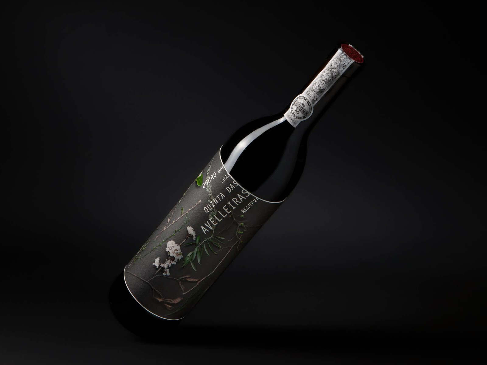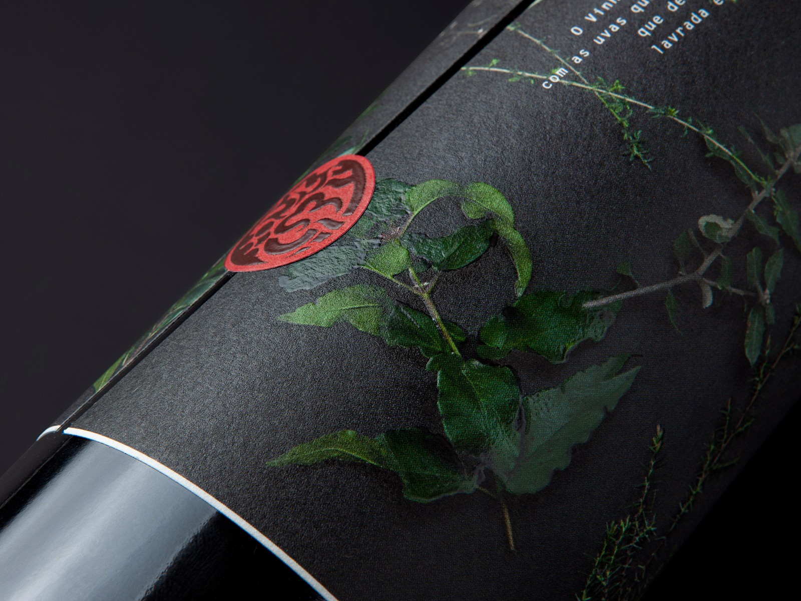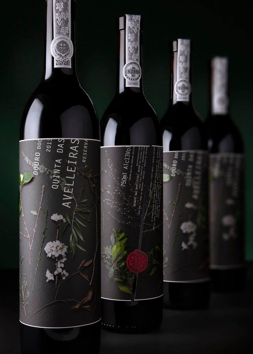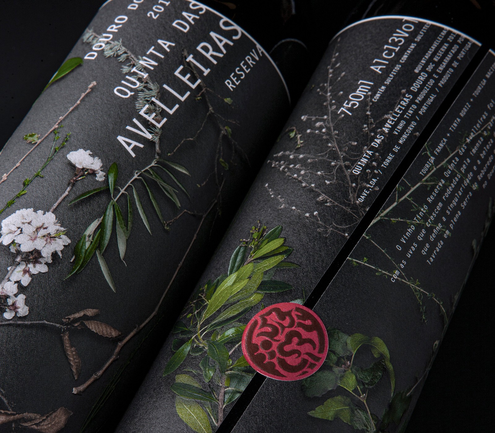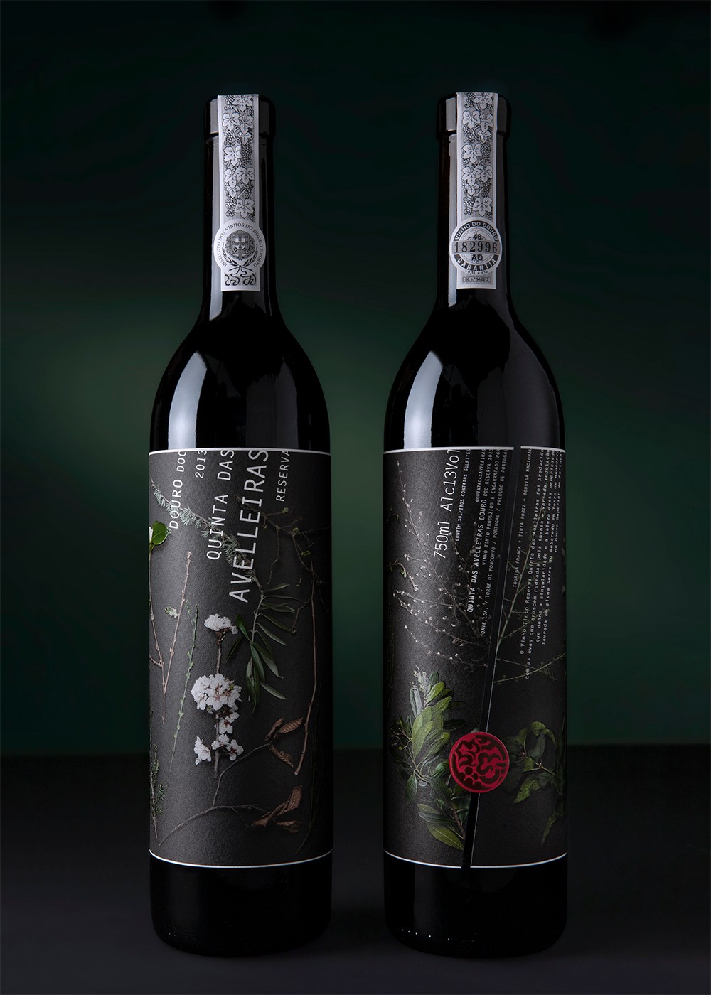 與標(biāo)簽的傾斜切口的角度平行設(shè)置的傾斜文本從上帶向下流到下帶,從而創(chuàng)建了一個(gè)框架,使圖形元素可以呼吸。圖紙的嚴(yán)格程度,膠版印刷(CMYK),面漆的應(yīng)用-保留的啞光清漆和高浮雕-以及紙張的選擇(Arconvert Cotone Bianco)都產(chǎn)生了標(biāo)簽,可以通過(guò)增加價(jià)值來(lái)提高產(chǎn)品質(zhì)量到Quinta das Avelleiras Reserva Douro包裝。