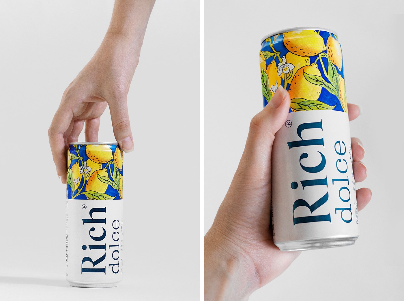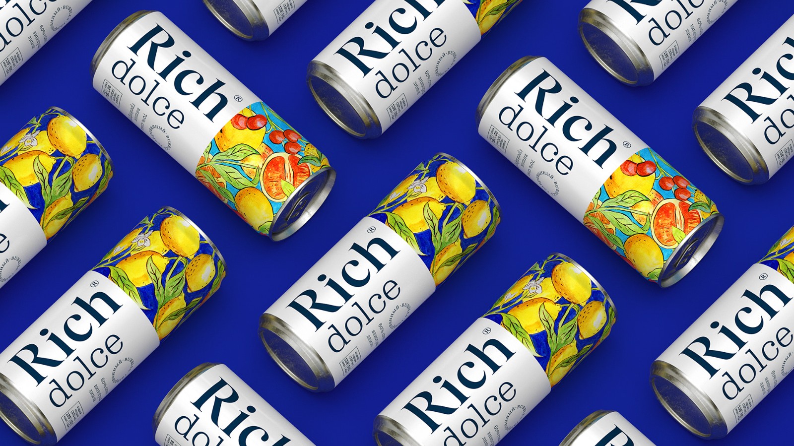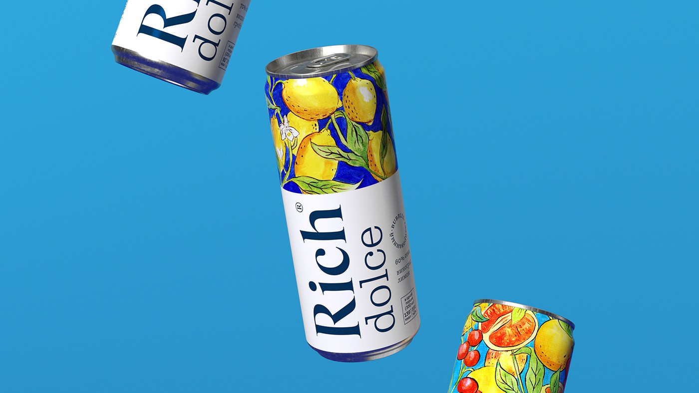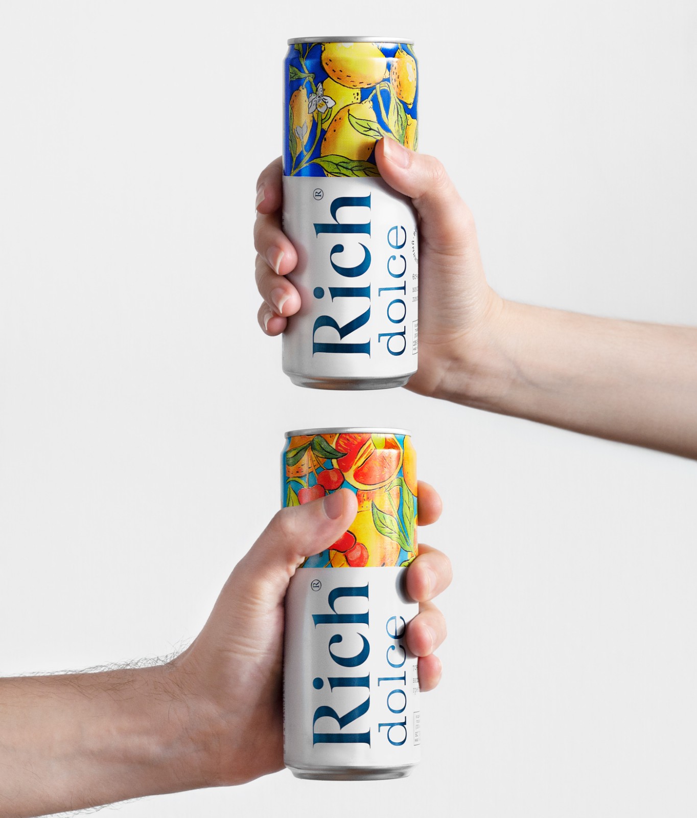 設(shè)計簡報果汁和花蜜品牌Rich推出了一種名為Rich Dolce的新產(chǎn)品,這是天然碳酸果汁飲料氣泡系列中的第一款產(chǎn)品。受意大利南部傳統(tǒng)的啟發(fā),Rich Dolce飲料含有高達70%的水果和漿果汁、水和泡沫,不添加糖。該產(chǎn)品有兩種口味:酸葡萄柚甜櫻桃和清爽的檸檬。創(chuàng)造一個視覺形象,反映簡潔和豐富的飲料性質(zhì),并顯示明亮的意大利性格。解決方案在開發(fā)設(shè)計的過程中,團隊希望創(chuàng)造一個明亮、相關(guān)的解決方案,突出這種飲料并展示其優(yōu)勢。 大的標志可以很容易地識別里奇品牌,這是果汁中公認的質(zhì)量標志?!癉olce”字體指的是具有歷史意義的19世紀克拉倫登字體。弗蘭創(chuàng)造的克拉倫登圖形公司(Clarendon Graphic)的ois Rappaud是這種類型字體的一種新的圖形方法,體現(xiàn)了它的現(xiàn)代主義潛力。泡泡線上有一個圓形標志。 黃色和藍色/紅色和藍色的對比組合使其引人注目,明亮的藝術(shù)插圖參考了托斯卡納majolica的傳統(tǒng),讓人們感受到意大利的精神。