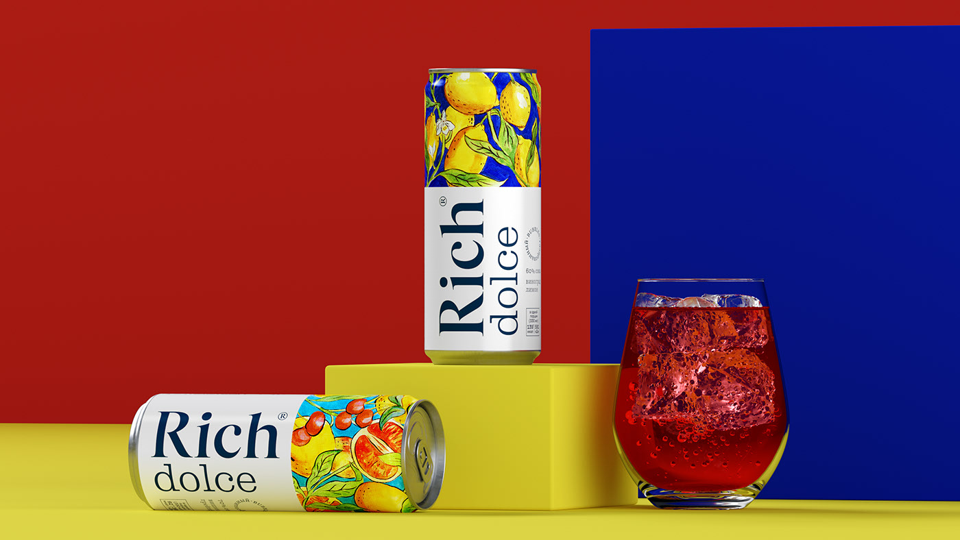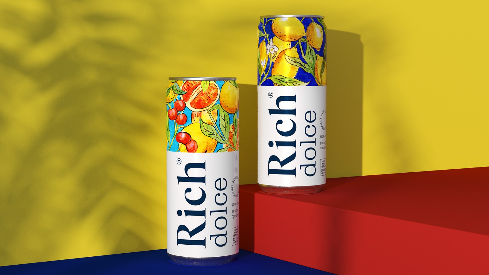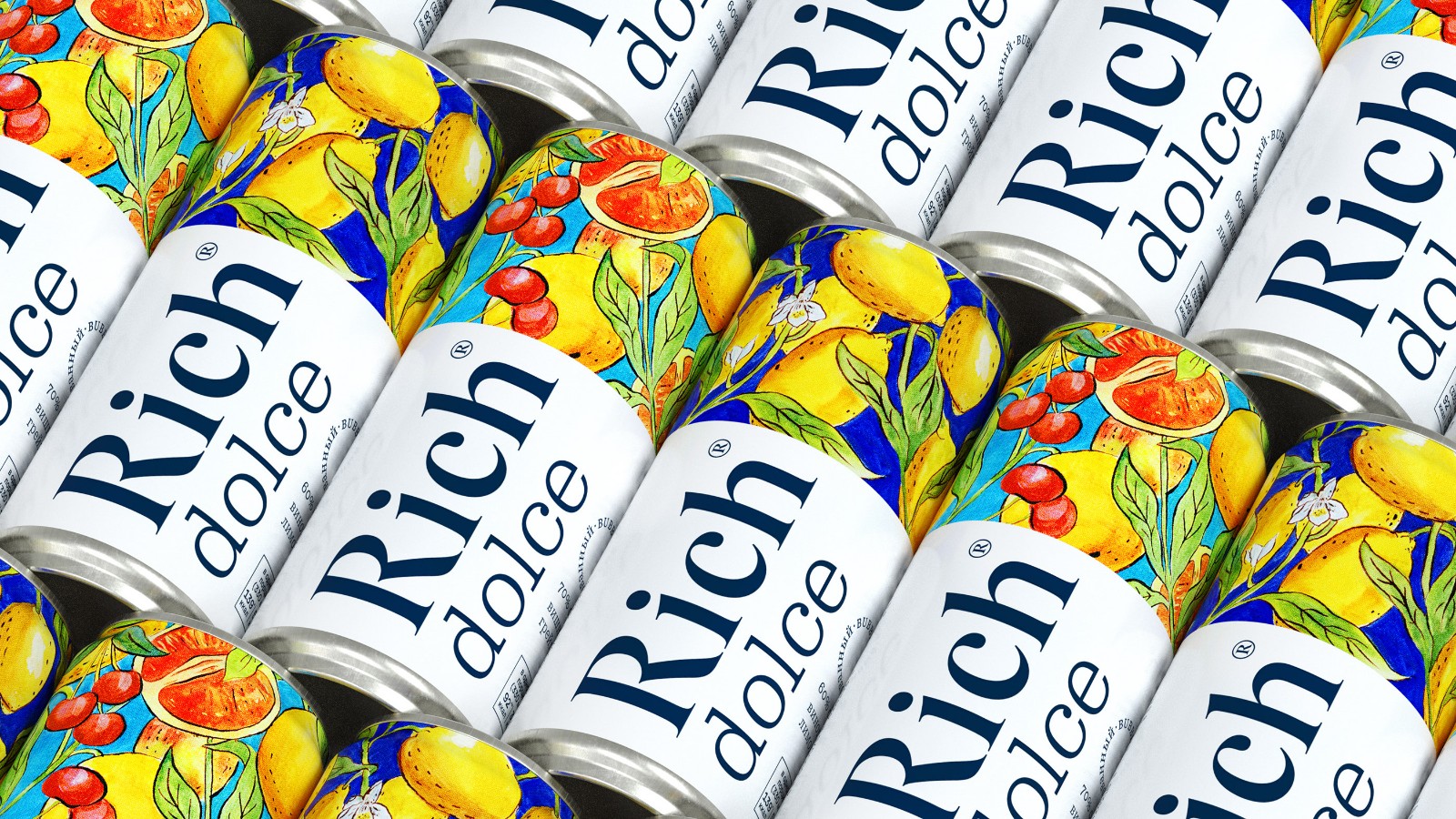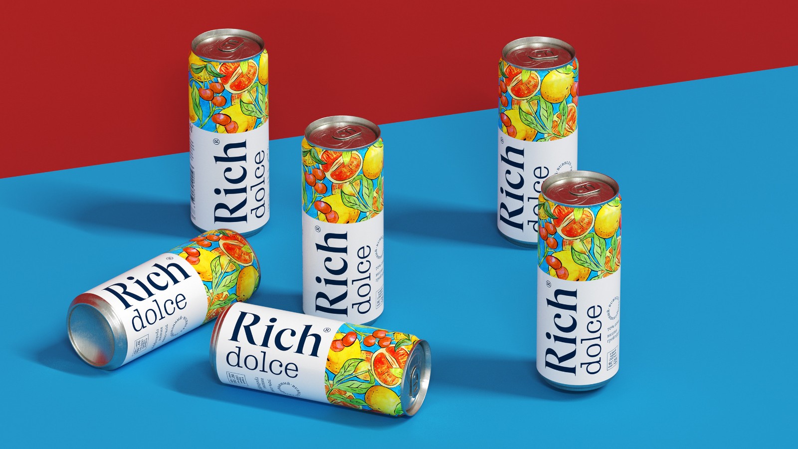 設(shè)計簡報果汁和花蜜品牌Rich推出了一種名為Rich Dolce的新產(chǎn)品,這是天然碳酸果汁飲料氣泡系列中的第一款產(chǎn)品。受意大利南部傳統(tǒng)的啟發(fā),Rich Dolce飲料含有高達70%的水果和漿果汁、水和泡沫,不添加糖。該產(chǎn)品有兩種口味:酸葡萄柚甜櫻桃和清爽的檸檬。創(chuàng)造一個視覺形象,反映簡潔和豐富的飲料性質(zhì),并顯示明亮的意大利性格。解決方案在開發(fā)設(shè)計的過程中,團隊希望創(chuàng)造一個明亮、相關(guān)的解決方案,突出這種飲料并展示其優(yōu)勢。 大的標志可以很容易地識別里奇品牌,這是果汁中公認的質(zhì)量標志?!癉olce”字體指的是具有歷史意義的19世紀克拉倫登字體。弗蘭創(chuàng)造的克拉倫登圖形公司(Clarendon Graphic)的ois Rappaud是這種類型字體的一種新的圖形方法,體現(xiàn)了它的現(xiàn)代主義潛力。泡泡線上有一個圓形標志。 黃色和藍色/紅色和藍色的對比組合使其引人注目,明亮的藝術(shù)插圖參考了托斯卡納majolica的傳統(tǒng),讓人們感受到意大利的精神。