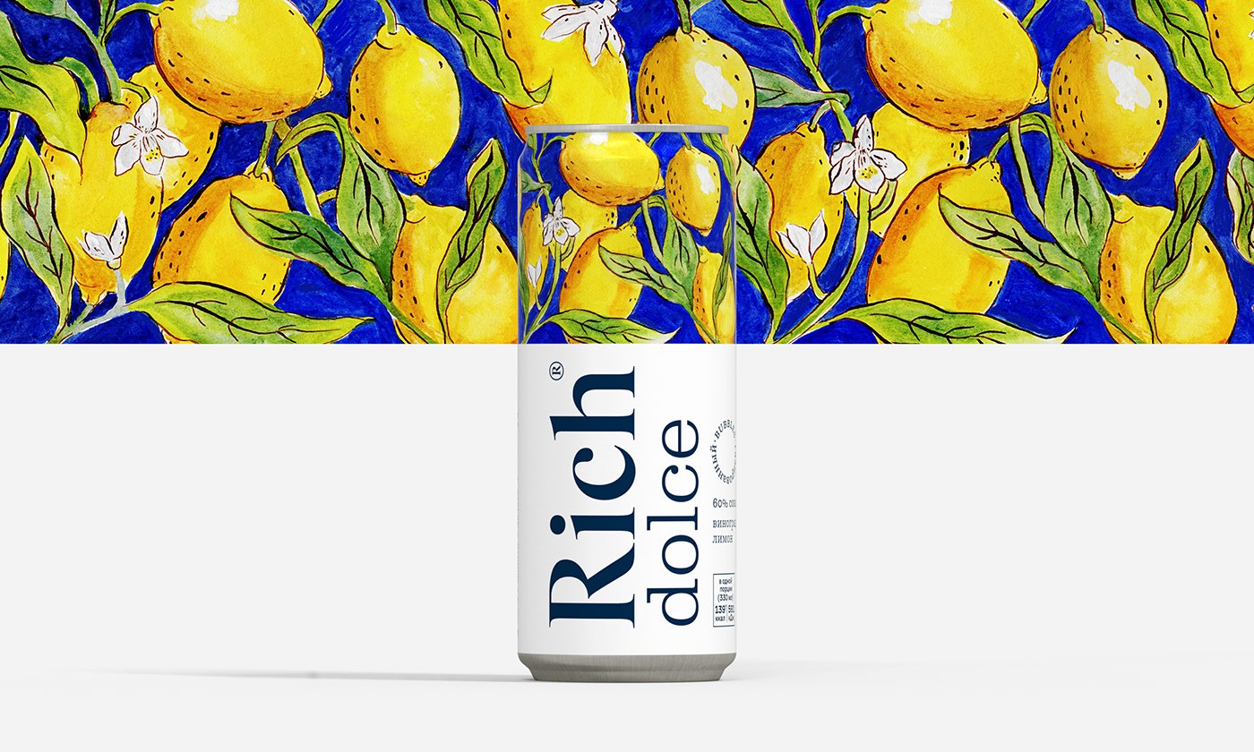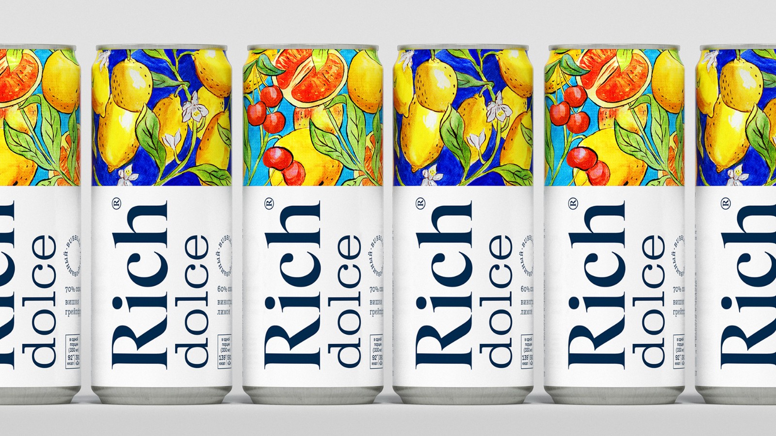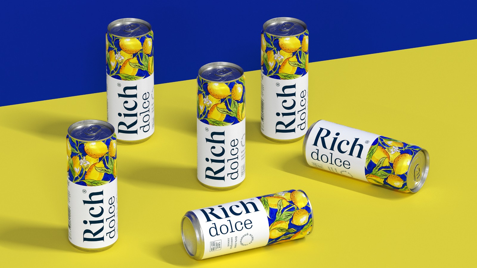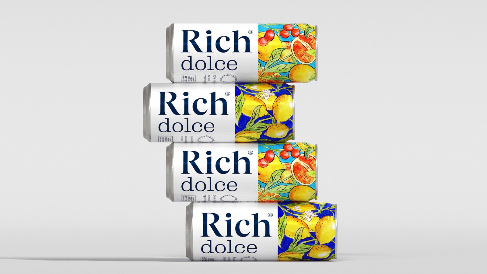 設(shè)計簡報果汁和花蜜品牌Rich推出了一種名為Rich Dolce的新產(chǎn)品,這是天然碳酸果汁飲料氣泡系列中的第一款產(chǎn)品。受意大利南部傳統(tǒng)的啟發(fā),Rich Dolce飲料含有高達70%的水果和漿果汁、水和泡沫,不添加糖。該產(chǎn)品有兩種口味:酸葡萄柚甜櫻桃和清爽的檸檬。創(chuàng)造一個視覺形象,反映簡潔和豐富的飲料性質(zhì),并顯示明亮的意大利性格。解決方案在開發(fā)設(shè)計的過程中,團隊希望創(chuàng)造一個明亮、相關(guān)的解決方案,突出這種飲料并展示其優(yōu)勢。 大的標志可以很容易地識別里奇品牌,這是果汁中公認的質(zhì)量標志?!癉olce”字體指的是具有歷史意義的19世紀克拉倫登字體。弗蘭創(chuàng)造的克拉倫登圖形公司(Clarendon Graphic)的ois Rappaud是這種類型字體的一種新的圖形方法,體現(xiàn)了它的現(xiàn)代主義潛力。泡泡線上有一個圓形標志。 黃色和藍色/紅色和藍色的對比組合使其引人注目,明亮的藝術(shù)插圖參考了托斯卡納majolica的傳統(tǒng),讓人們感受到意大利的精神。