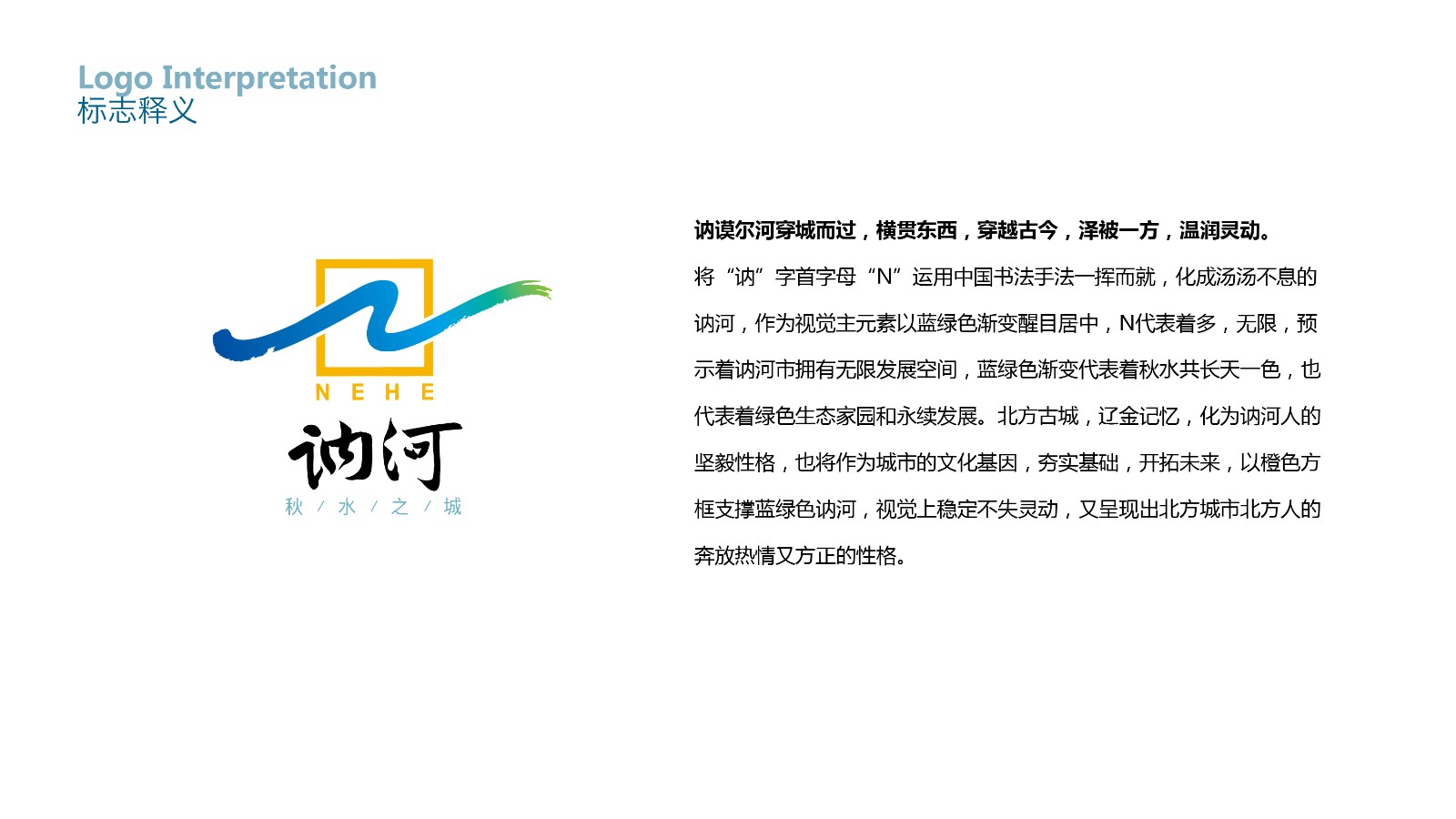 訥河城市品牌形象設(shè)計(jì)創(chuàng)意釋義:訥謨爾河穿越而過(guò),橫貫東西,穿越古今,澤被一方,溫潤(rùn)靈動(dòng)。我們將“訥”字首字母[N]運(yùn)用中國(guó)書法手法一揮而就,化成湯湯不息的訥河,作為視覺(jué)主元素以藍(lán)綠色漸變醒目居中,N代表著多,無(wú)限,預(yù)示著訥河擁有無(wú)限發(fā)展空間,藍(lán)綠色漸變代表著秋水共長(zhǎng)天一色,也代表著綠色生態(tài)家園和永續(xù)發(fā)展。北方古城,遼金記憶,化為訥河人的堅(jiān)毅性格,也將作為城市的文化基因,夯實(shí)基礎(chǔ),開(kāi)拓未來(lái),以橙色方框支撐藍(lán)綠色訥河,視覺(jué)上穩(wěn)定不失靈動(dòng),又呈現(xiàn)出北方城市北方人的奔放熱情又方正的性格。