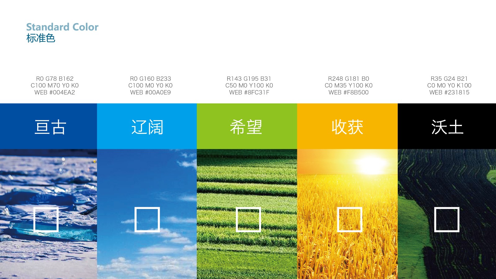 品牌標(biāo)準(zhǔn)色:亙古、遼闊、希望、收獲、沃土