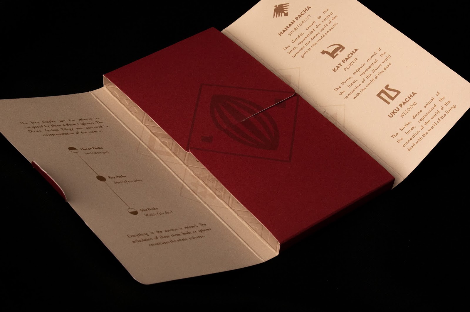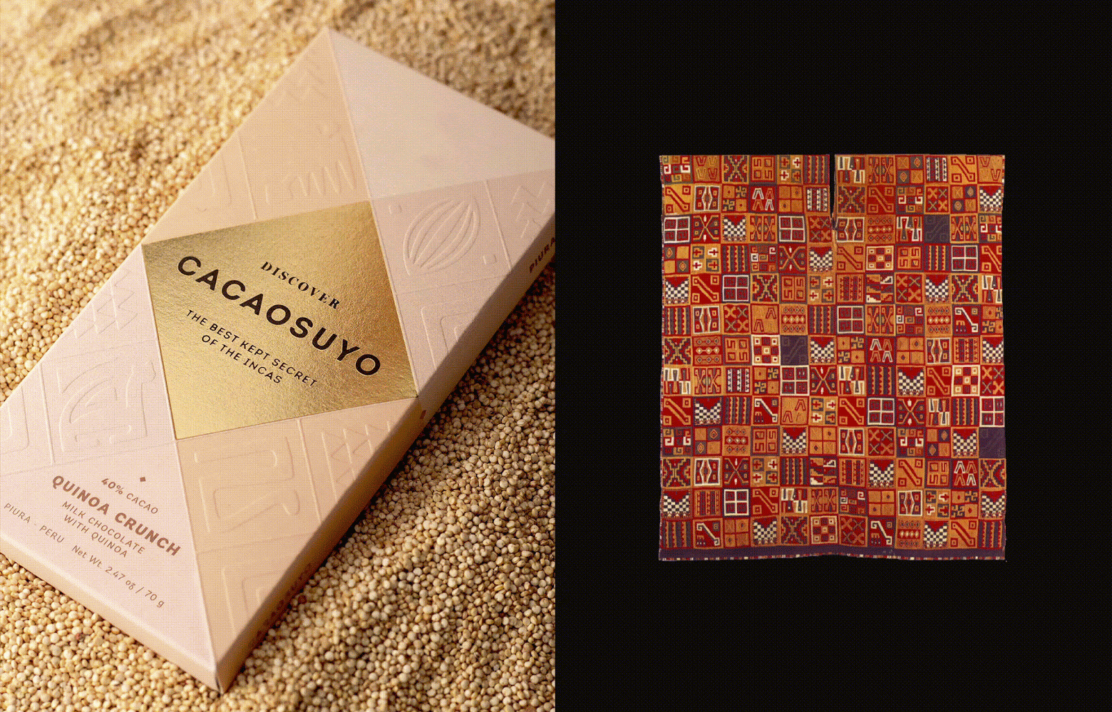 Cacaosuyo必須與該品牌的主張一致:“印加人的最佳機(jī)密”,因?yàn)樵谝曈X(jué)層面上,其內(nèi)容的價(jià)值尚未傳播。該品牌已經(jīng)有一個(gè)以tocapus(印加人的圖形通信系統(tǒng))為靈感的幾何系統(tǒng),我們決定維持此比例,但要更改其比例。此外,我們添加了代表安第斯三部曲(禿鷹,美洲獅和蛇)的圖標(biāo)系統(tǒng)。這樣,我們可以使品牌煥然一新,但保留其本質(zhì)。新包裝必須被視為真正的寶藏,這就是為什么我們給包含該品牌的鉆石賦予“金”質(zhì),而其余包裝就像織布機(jī)一樣,因此我們?cè)O(shè)法使它像博物館一樣。