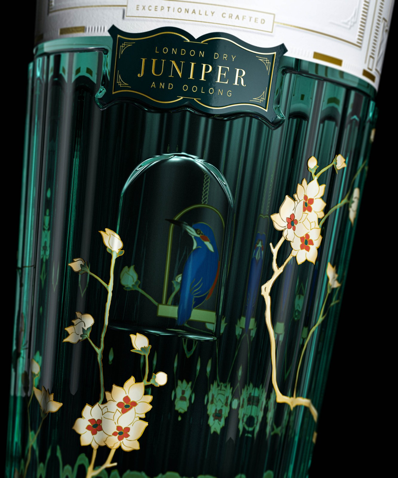 瓶身的設(shè)計(jì)靈感來(lái)自鳥(niǎo)籠的功能,而玻璃塞子則受慈禧皇后佩戴的傳統(tǒng)頭飾的影響。插畫(huà)風(fēng)格和技巧靈感來(lái)自清朝代花瓶,并營(yíng)造出籠中鳥(niǎo)兒的錯(cuò)覺(jué)。瓶子掛在盒子里完成概念。