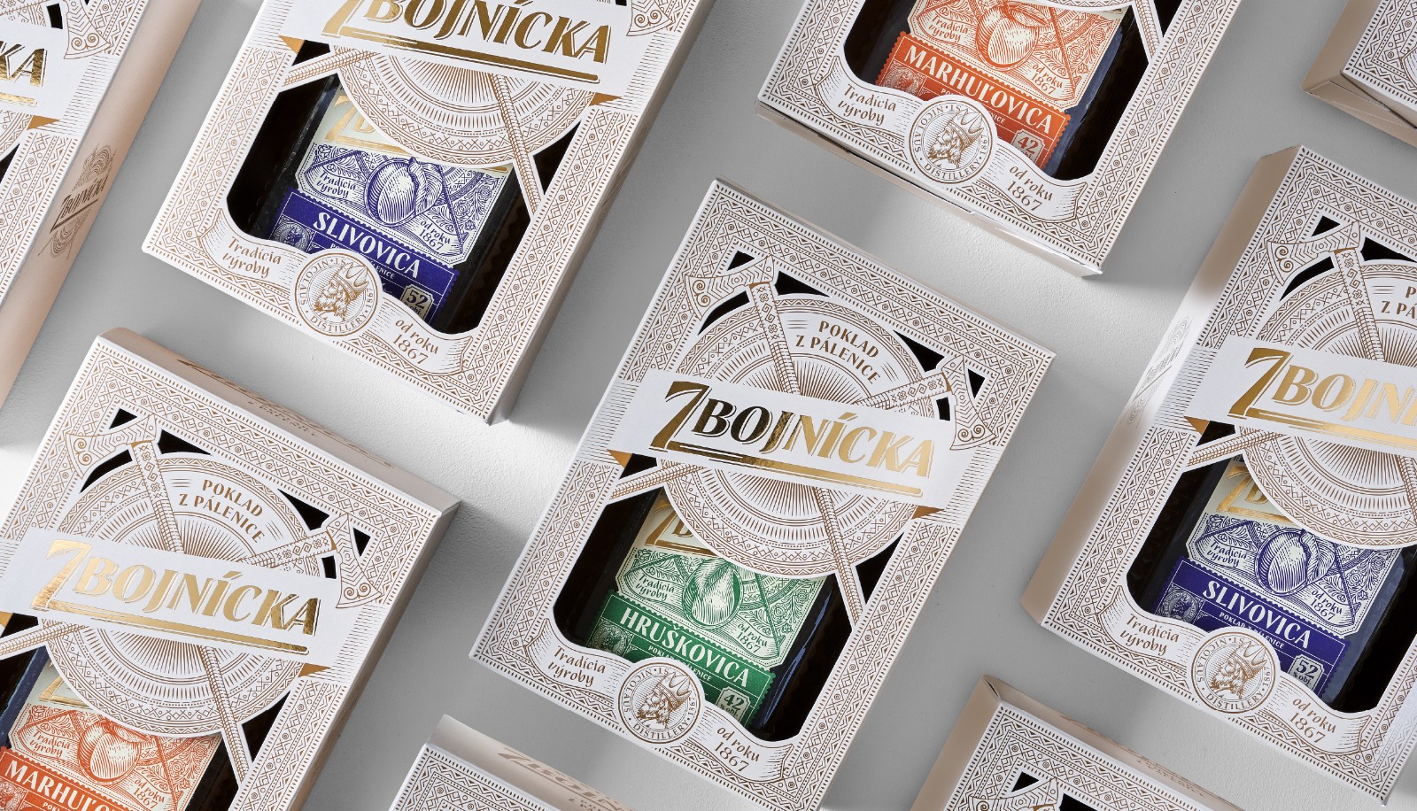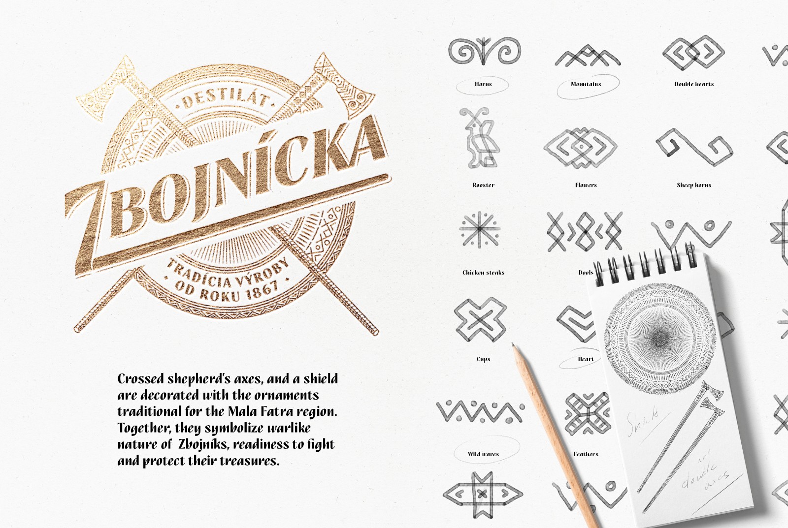 我們選擇了質(zhì)地柔軟的冰霜紙,以喚起一種天然的、自制的產(chǎn)品的感覺(jué)。雕刻風(fēng)格的插圖創(chuàng)造了一種被轉(zhuǎn)移到過(guò)去的印象。Zbojníks使用的十字牧羊人斧頭和一個(gè)飾以Mala Fatra地區(qū)傳統(tǒng)裝飾品的盾牌被放置在標(biāo)簽的中央。它們共同象征著Zbojníks人的特征--他們好戰(zhàn)的本性,愿意戰(zhàn)斗和保護(hù)他們的珍寶。標(biāo)簽的頂部是著名的韋爾克羅祖特克山的雕刻插圖,根據(jù)傳說(shuō),這里藏有許多珍寶。這種來(lái)自不同地區(qū)的斯洛伐克裝飾品的組合,增強(qiáng)了一個(gè)真正的本地,傳統(tǒng)產(chǎn)品的形象。
