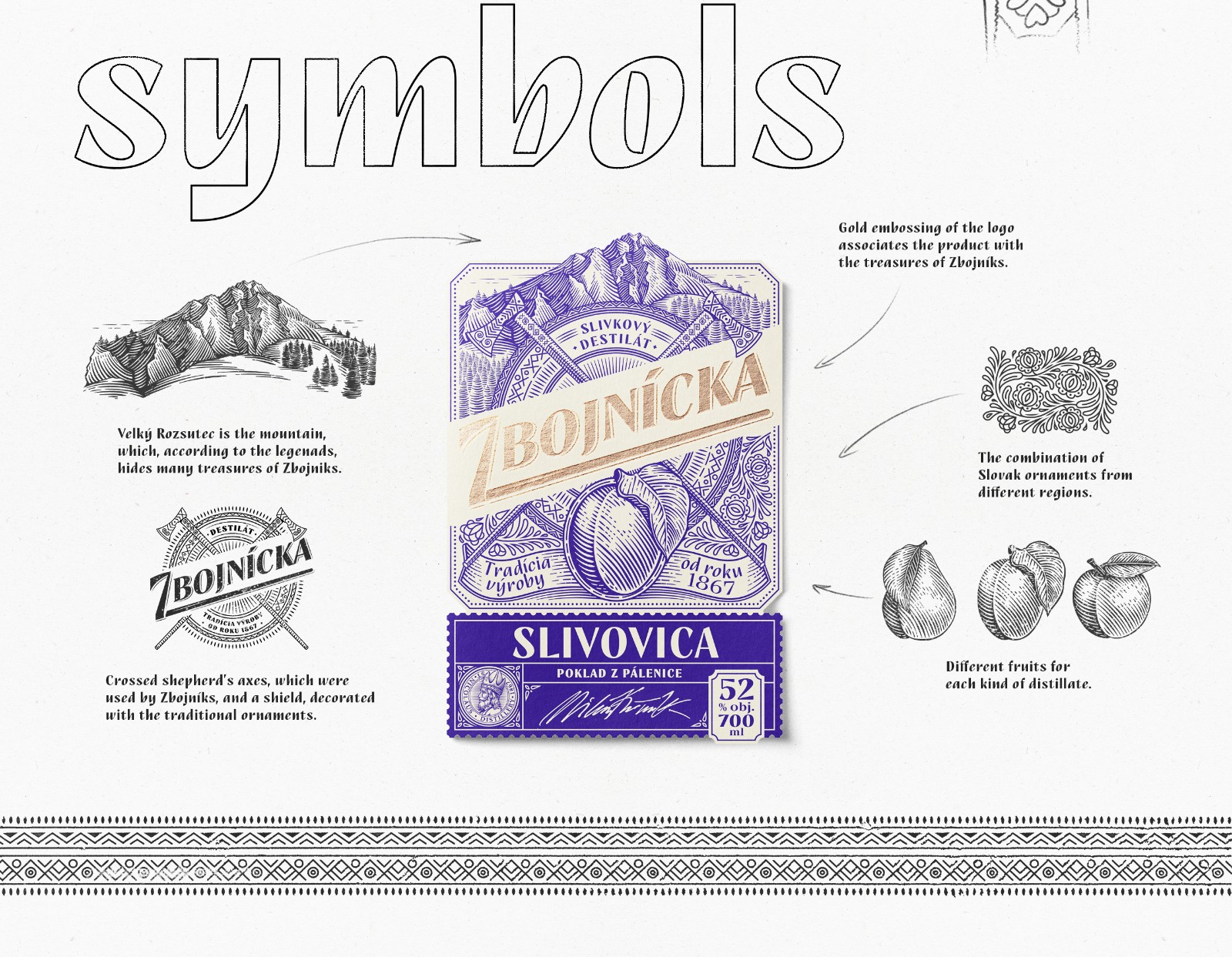 這個(gè)想法成為我們創(chuàng)建標(biāo)簽的起點(diǎn)。Zbojnícka餾分油是Zbojníks的真正寶藏。標(biāo)簽的每一個(gè)元素都有其意義,并講述了斯洛伐克民間傳說(shuō)中獨(dú)特的故事。