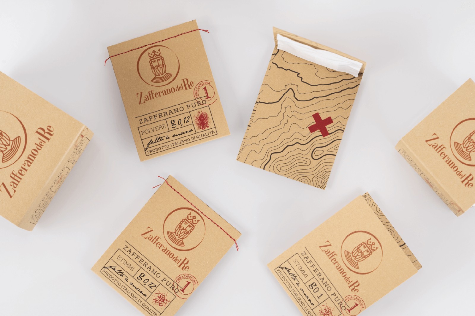 像國王寶藏中的黃金那樣的貴重產(chǎn)品,以純藏紅花的形式分布在柱頭和粉末中,像食用花卉一樣干燥,加到蜂蜜中成為原始的Smielace,與面粉混合后變成L'oro del Busento。每個包裝都是用手封閉的,即使是單劑量包裝的密封圈也帶有紅色螺紋接縫。每包中都包含一張藏寶圖,以強(qiáng)調(diào)藏紅花的概念:藏寶。
