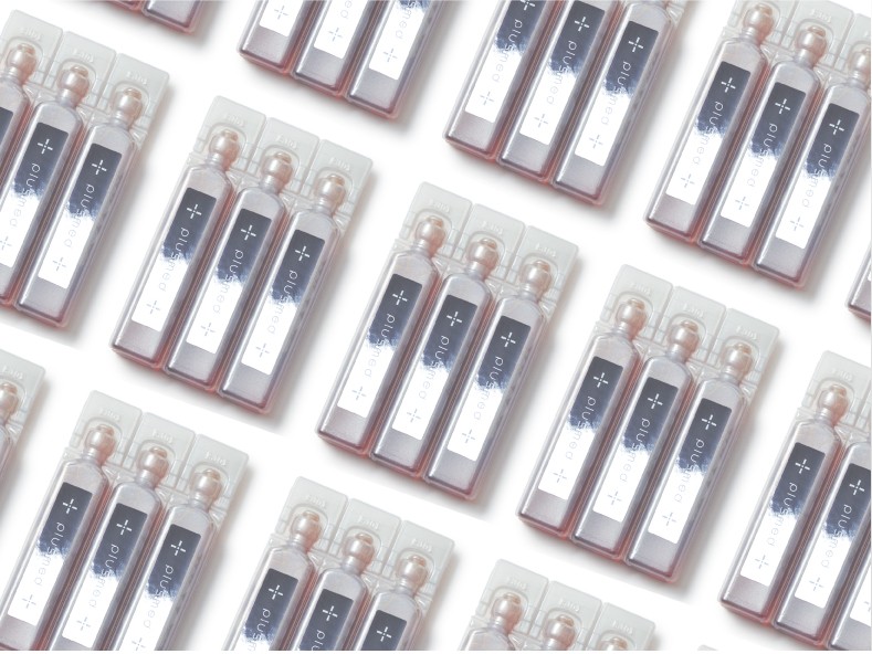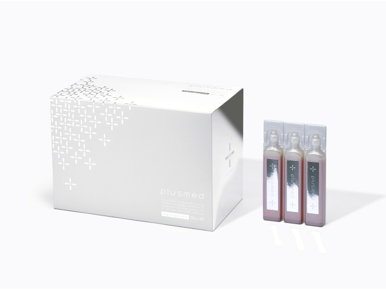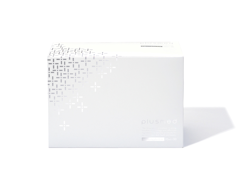 將醫(yī)學(xué)十字架創(chuàng)意極簡形態(tài),中間的支點是不變的初心,四條線也有光線的感覺,與醫(yī)學(xué)美容行業(yè)相符,PLUSMED美容產(chǎn)品的創(chuàng)意包裝,銀卡紙禮盒,高端清爽,大氣時尚。