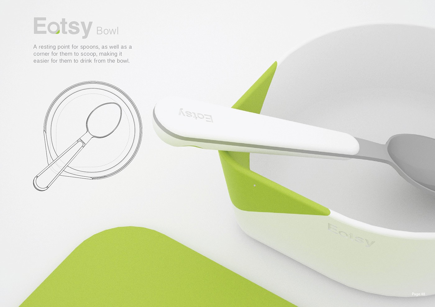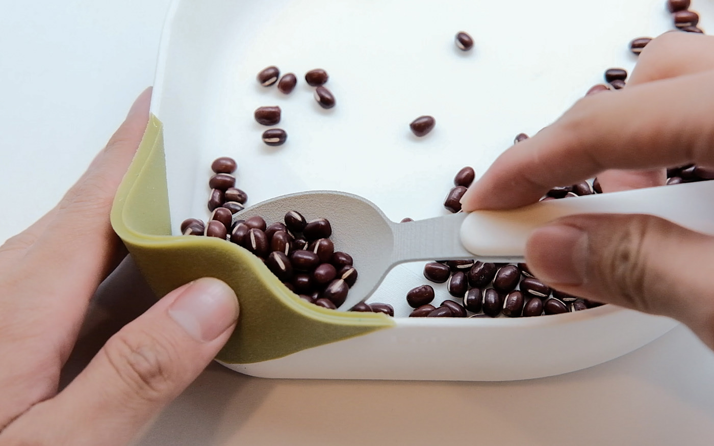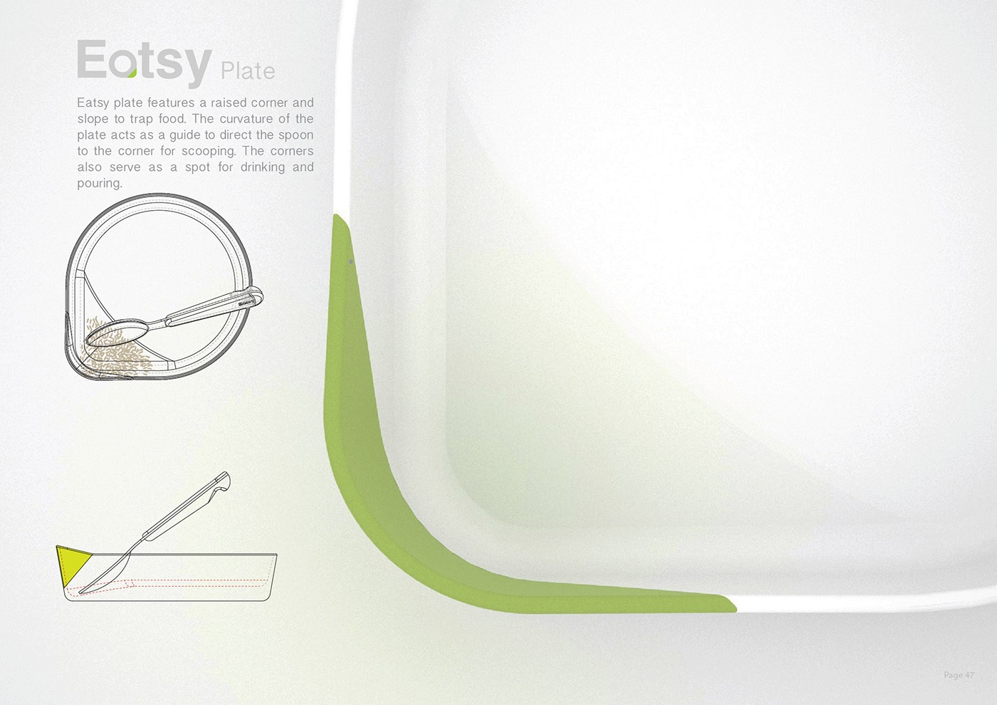 Eatsy 盤子的特點(diǎn)是有一個(gè)凸起的角落和斜坡來夾住食物。盤子的曲率作為引導(dǎo),將勺子引導(dǎo)到角落進(jìn)行舀。角落也可以作為飲用和傾倒的地方。