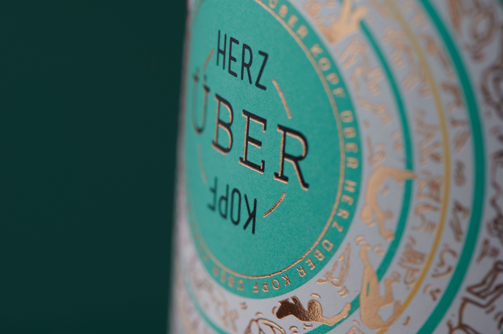 我們的回應(yīng)是設(shè)計一個包裝概念,在德國中端市場引起興趣,帶有一個有吸引力的標簽,強大但不壓倒性。我們通過一種超級時髦和現(xiàn)代的設(shè)計實現(xiàn)了這一點,并以顏色和形狀的經(jīng)典設(shè)計價值為支持,以幫助品牌回憶和識別——非常強烈的圓圈和青色——在五米外創(chuàng)造回憶。品牌故事因裝飾細節(jié)而栩栩如生 - 一旦您掌握了品牌,您就會參與其中的“心動”時刻中人們的微小輪廓。圓圈似乎代表能量的漣漪,從也描繪品牌名稱的標簽中心脈動,巧妙地倒置“Kopf”作為品牌精神的字面解釋。
