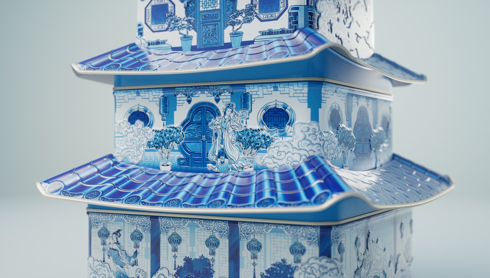 傳統(tǒng)的青花國風(fēng)為設(shè)計(jì)風(fēng)格,一個(gè)有創(chuàng)意的鐵盒,使他賦予靈魂,設(shè)計(jì)點(diǎn)在于層疊設(shè)計(jì)與天宮的寓意