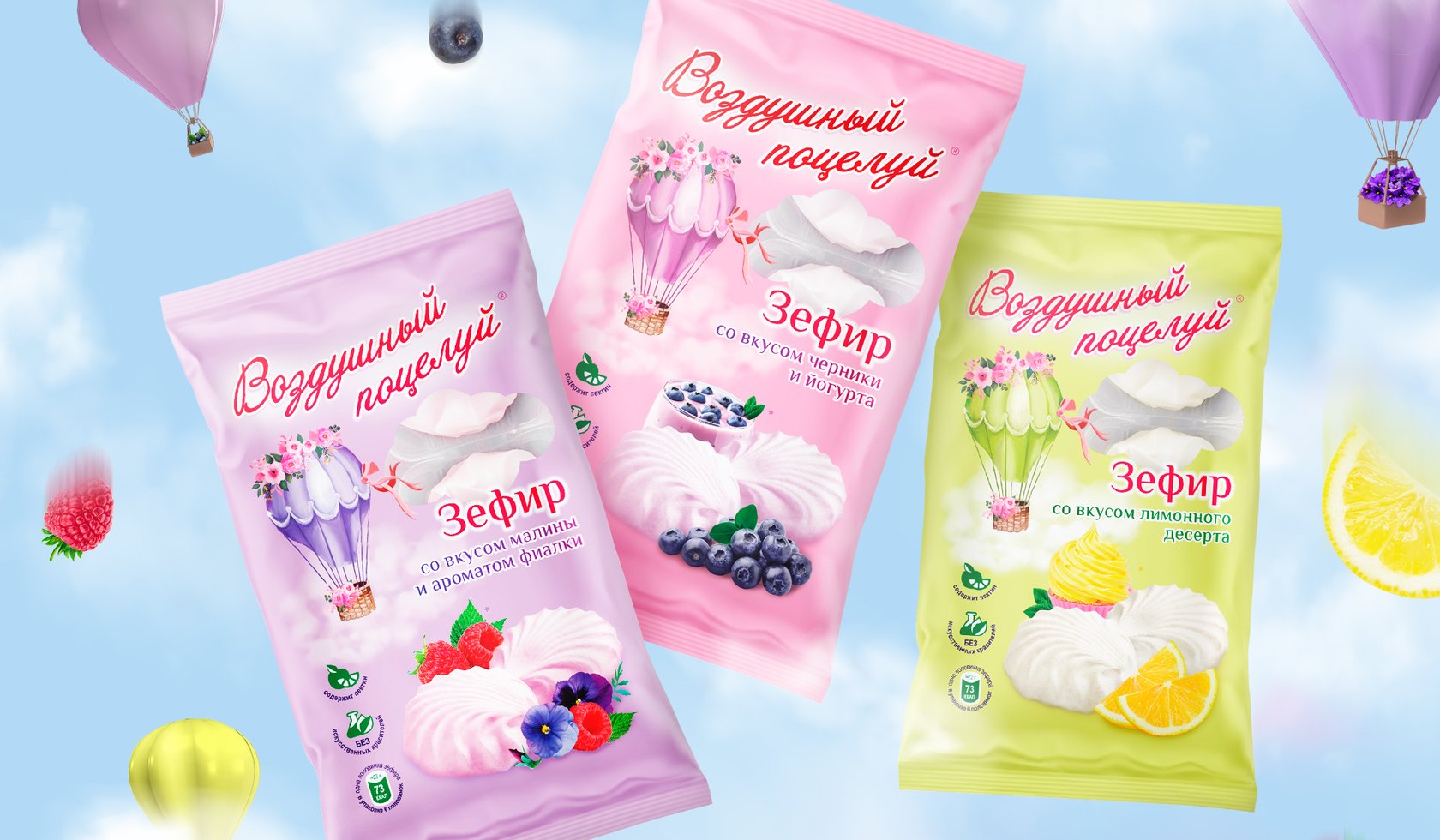 三種口味的棉花糖系列 Air Kiss 的包裝設(shè)計(jì):Sormovskaya Confectionary Factory 品牌的覆盆子紫羅蘭、檸檬甜點(diǎn)、藍(lán)莓酸奶。