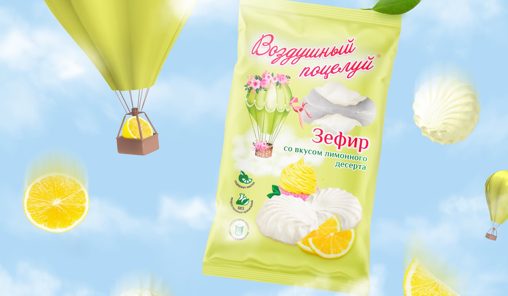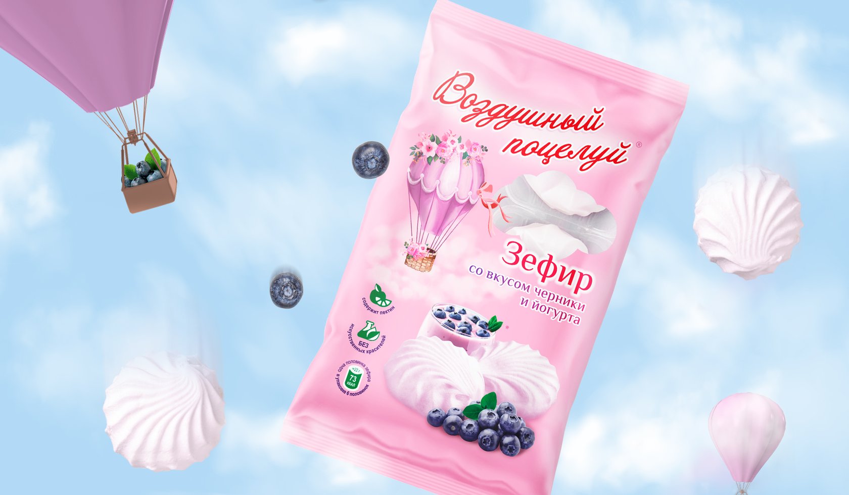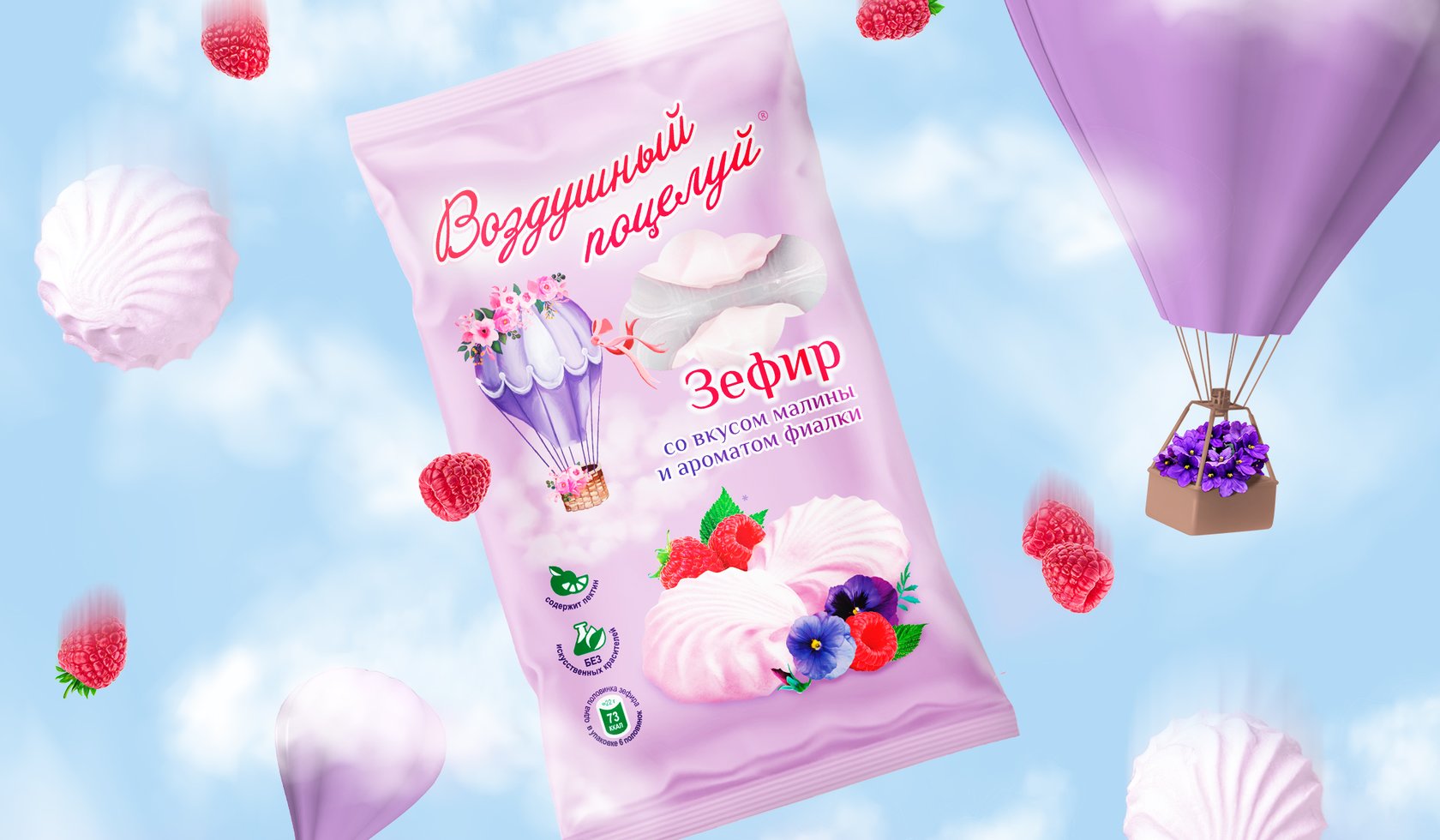 糖果系列的一個(gè)特點(diǎn)是為那些想要嘗試新事物的人提供不同尋常的原始口味。因此,對(duì)于口味的顏色識(shí)別,選擇多汁、歡快但不太鮮艷的顏色,以保持產(chǎn)品的柔軟和柔嫩的感覺。我們開發(fā)了 Air Kiss 系列名稱的風(fēng)格,強(qiáng)調(diào)浪漫和俏皮的心情。作者在背景上繪制的氣球和柔和的云彩的插圖為整體構(gòu)圖增添了輕盈和柔情。
